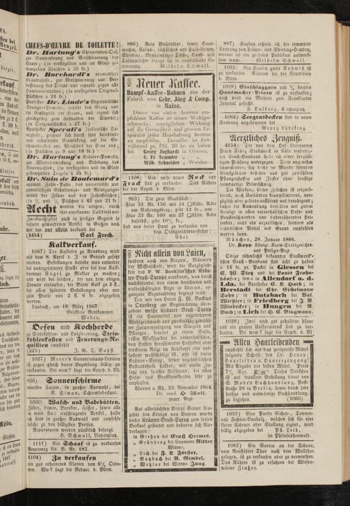 _Dieser von vielen Aerzten empfohlene Kaffee ist seines Wohlgeschmacks , vorzüglichen Wirkung auf die Gesundheit und grossen Erspar niss jeder Haushaltung bestens zu empfehlen. Derselbe ist fortwährend pr. Pfd. 20 kr. zu haben bei Georg Jughardt in Giessen,