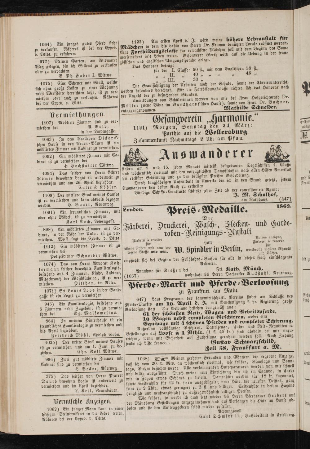 vast ick vom 2^d^MtS. an wöchentlich zweimal, wie früher, Samstags und Sonntags, Gießen besuchen werke. Alle vorkommendcn Hutrcparaturcn werden von nur schnell und billig ausgefübrt. Durch meine neue Einrichtung bin ick tm Stande, in Farbe wie in Fa^on etwas Schönes zu liefern. Da,nenhütc werden ,ur 18 kr. fa?onmrt sowie Seidenhüte für 12 kr. fein auSgebügel.; neue Vute, die neuesten Dessins ganz feine zu 2 Thlr., etwas geringere zu 3 fl. und billiger, «eidenhute in beiden Fa? (englisch und neufranzösisch) zu auhergewöhnlich billigen Preisen. , f