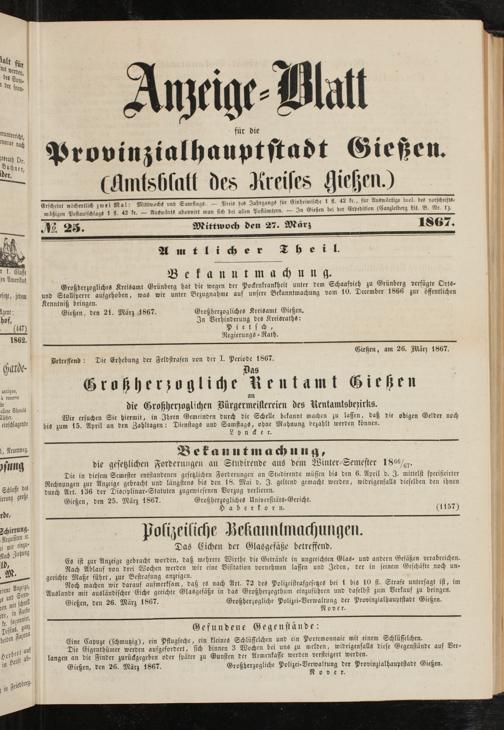 Gießen, den 21. März 1867. Großherzogliches Kreisamt Gießen.