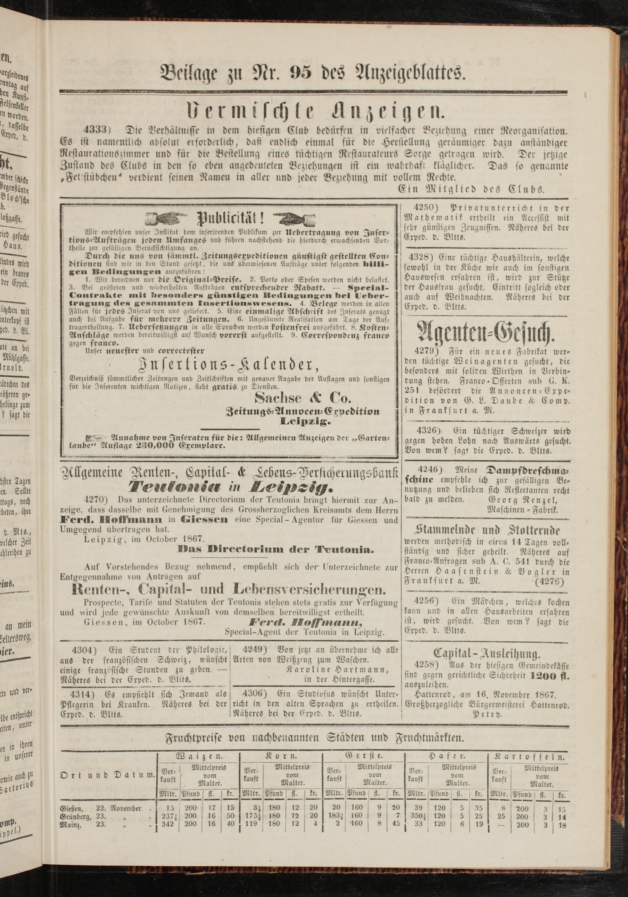 4270) Das unterzeichnete Directorium der Teutonia bringt hiermit zur Anzeige. dass dasselbe mit Genehmigung des Grossherzoglichen Kreisamts dem Herrn Ferri. Hollmanu in (eicssen eine Special - Agentur für Giessen und Umgegend übertragen hat.