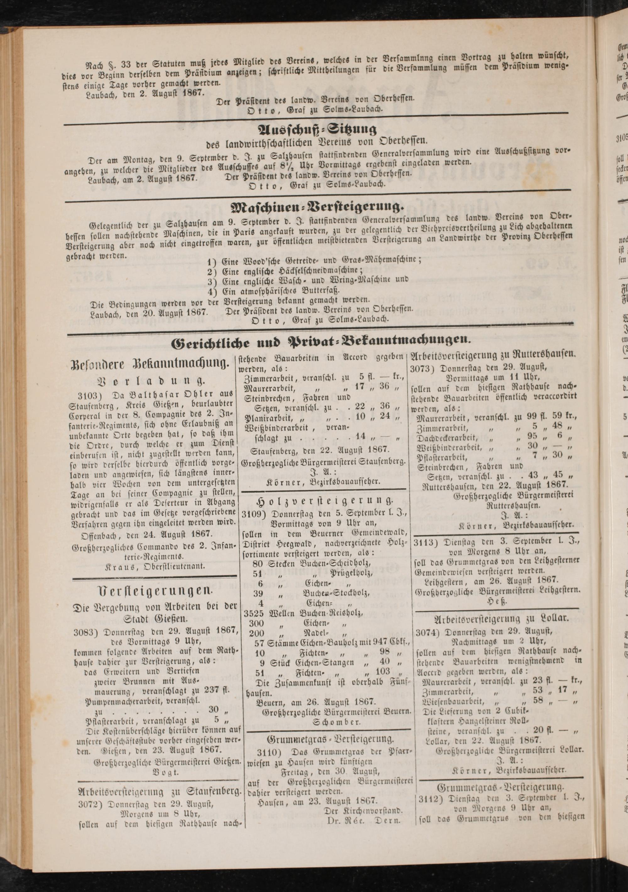 Laubach, den 2. August 1867. yr5^Ctnt tea lantto. Vereins von Oberhessen.