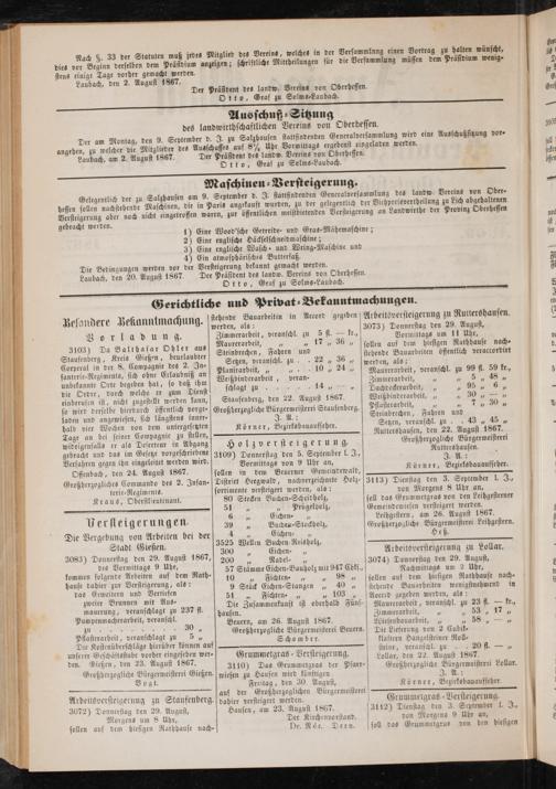 Laubach, den 20. August 1867. Der Präsident des landw. Vereins von oberheffen. Otto, Graf zu Solms-Laubach.