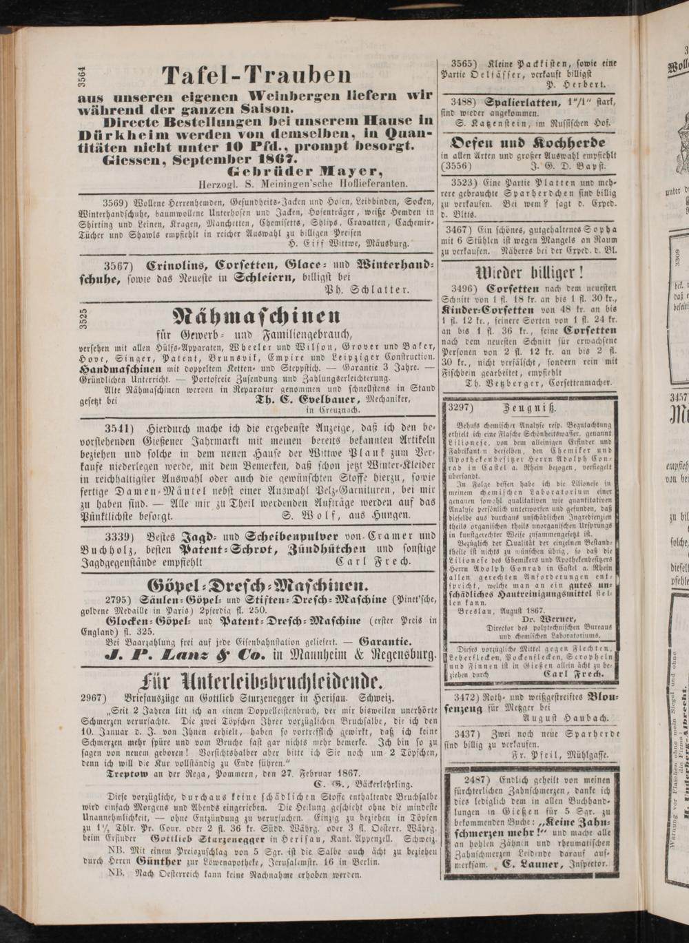 3496) Corsetten nach dem neuesten Schnitt von 1 fl. 18 fr. an bis 1 fl. 30 fr., Kinder-Corfetten von 48 fr. an bis 1 fl. 12 fr., feinere Sorten von 1 fl. 24 fr. an bis 1 fl. 36 fr., feine Corsetten nach dem neuesten Schnitt für erwachsene Personen von 2 fl. 12 fr. an bis 2 fl. 30 fr., nicht verfälscht, sontern rein mit Fischbein gearbeitet, empfiehlt