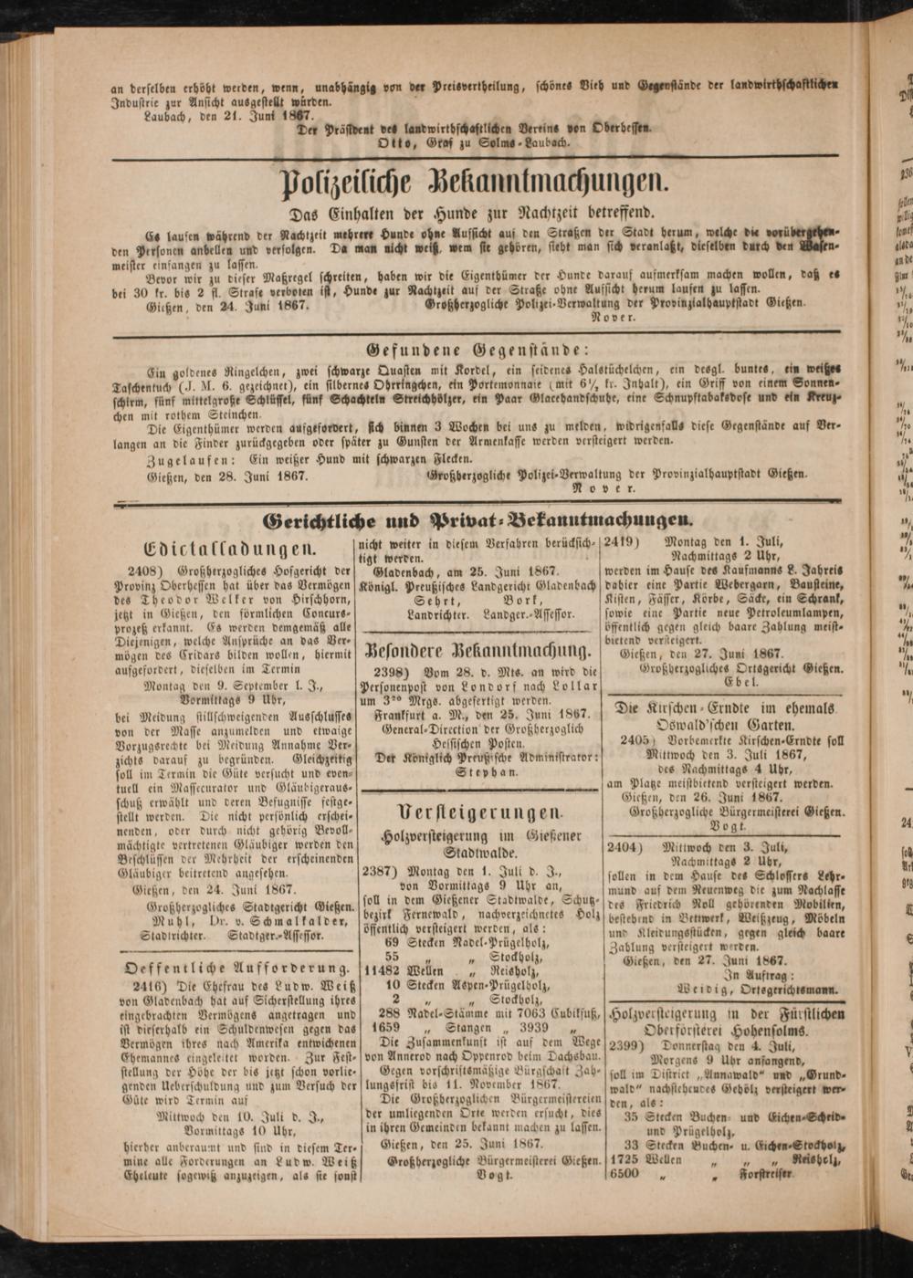 Gießen, den 28. Juni 1867. Großh»rzogliche Polizei-Verwaltung der Provinzialhauptstadt Gießen.