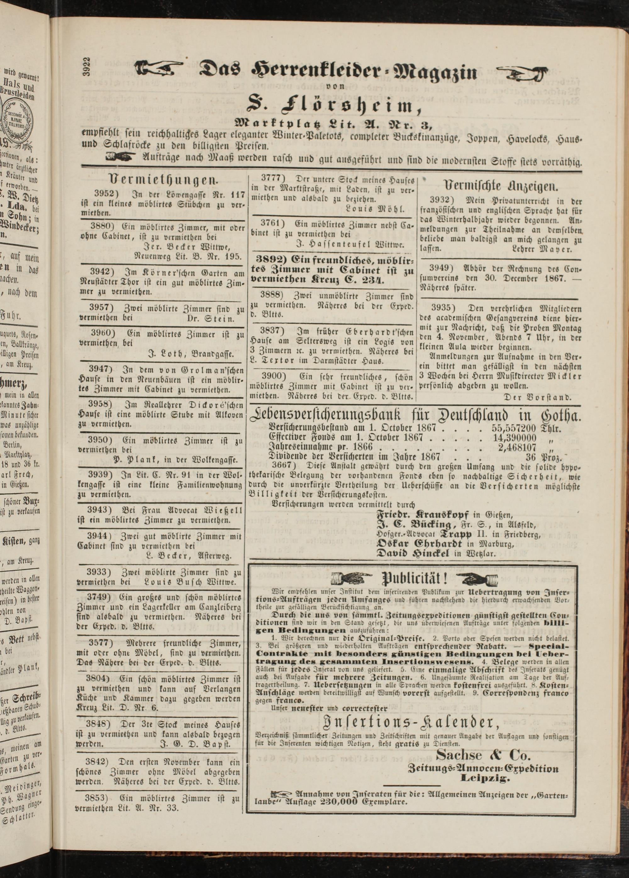 SS5 Annahme von Inseraten für die: Allgemeinen Anzeigen der „Gartenlaube" Auflage 230,000 Exemplare.