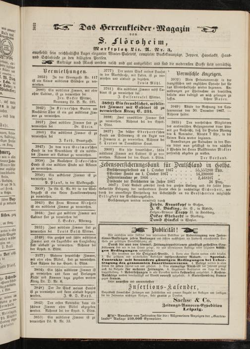 Leöensversicherungsöcuck für Deutschland in Hotha. BersicherungSbestand am 1. Oktober 1867 .... 55,557200 Thlr. Effcctivcr Fonds am 1. Oktober 1867 ..... 14,390000 „