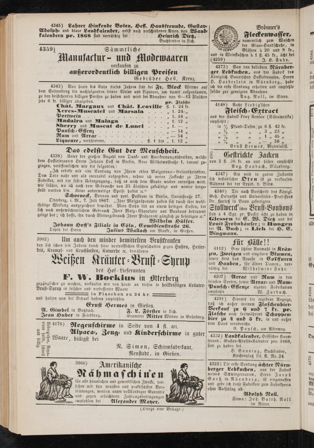 4345) Lahrer Hinkende Boten, Hess. Hausfreunde, Gustav- Adolph- und blaut Landkalender, ncbjt noch vtrfchitdtntn Arten von 28aud- kalendern pr. 1868 sind vorräihig bei Heinrich Dietz,