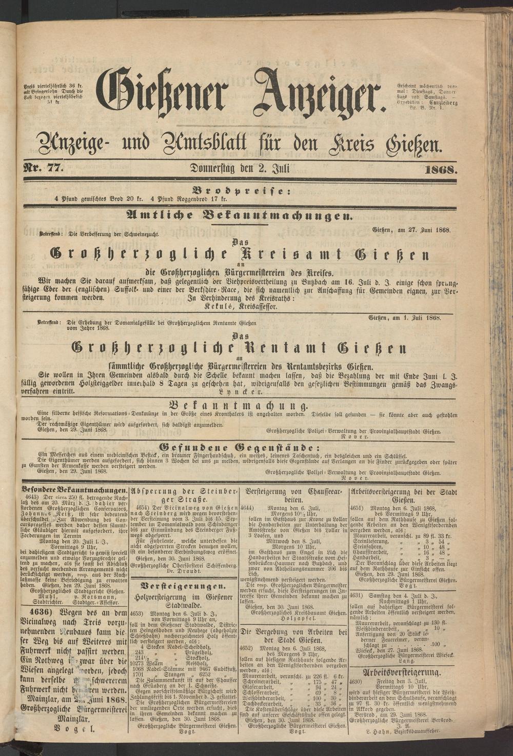 Die Großherzoglichen Bürgermeistereien der umliegenden Orte werden ersucht, dies in ihren Gemeinden bekannt machen zu lassen- Gießen, den 30. Juni 1868-