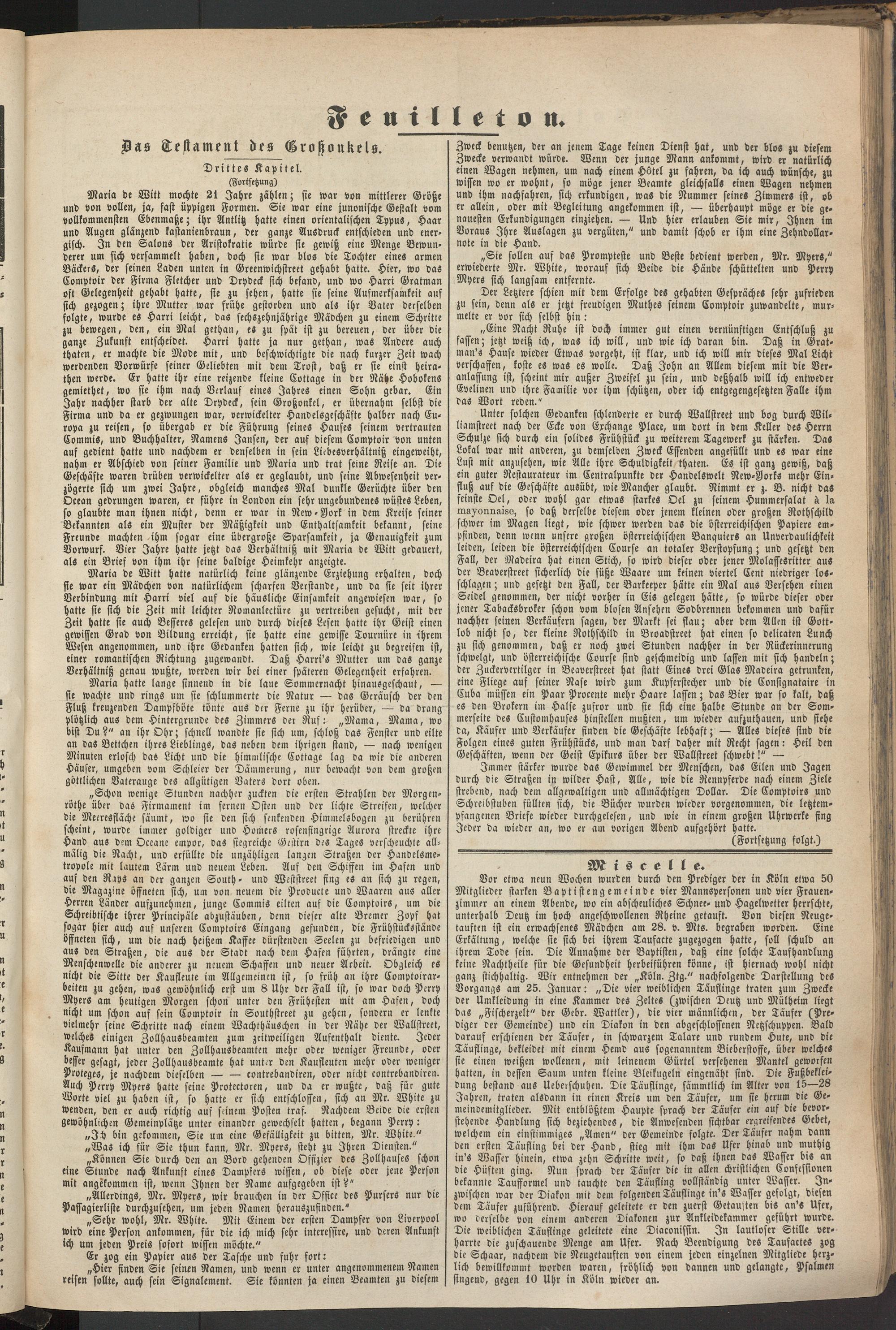 „Schon wenige Stunden nachher zuckten die ersten Strahlen der Morgen- röthe über das Firmament im fernen Osten und der lichte Streifen, welcher die Meeresfläche säumt, wo sie den sich senkenden Himmelsbogen zu berühren scheint, wurde immer goldiger und Homers rosenfingrige Aurora streckte ihre Hand aus dem Oceane empor, das siegreiche Gestirn des Tages verscheuchte all- mälig die Nacht, und erfüllte die unzähligen langen Straßen der Handelsmetropole mit lautem Lärm und neuem Leben. Auf den Schiffen int Hafen und auf den Rays an der ganzen South- und Weststreet sing es an sich zu regen, die Magazine öffneten sich, um von neuem die Produete und Waaren aus aller Herren Länder aufzunehmen, junge Commis eilten auf die Comptoirs, um die Schreibtische ihrer Prineipäle abzuftauben, denn dieser alte Bremer Zopf hat sogar hier auch auf unseren Comptoirs Eingang gefunden, die Frühstücksstände öffneten sich, um die nach heißem Kaffee dürstenden Seelen zu befriedigen und aus den Straßen, die aus der Stadt nach dem Hafen führten, drängte eine Menschenwelle die anderer zu neuem Schaffen und neuer Arbeit. Obgleich es nicht die Sitte der Kaufleute im Allgemeinen ist, so früh an ihre Comptoirarbeiten zu gehen, was gewöhnlich erst um 8 Uhr der Fall ist, so war doch Perry Myers am heutigen Morgen schon unter den Frühesten mit am Hafen, doch nicht um schon auf sein Comptoir in Southstreet zu gehen, sondern er lenkte vielmehr seine Schritte nach einem Wachkhäuschen in der Nähe der Wallstreet, welches einigen Zollhausbeamten zum zeitweiligen Aufenthalt diente. Jever Kaufmann hat unter den Zollhausbeamten mehr oder weniger Freunde, oder besser gesagt, jeder Zollhausbeamte hat unter den Kaufleuten mehr oder weniger Proteges, je nachdem dieselben--contrebandiren, oder nicht eontrebandiren.