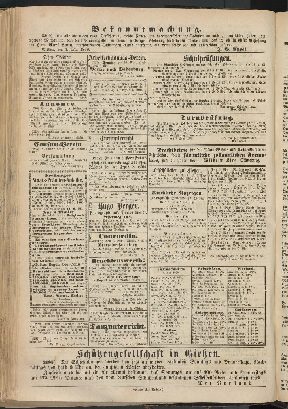 Gießen, den 7. Ma! 1868. Der evang. Schulvorstand.