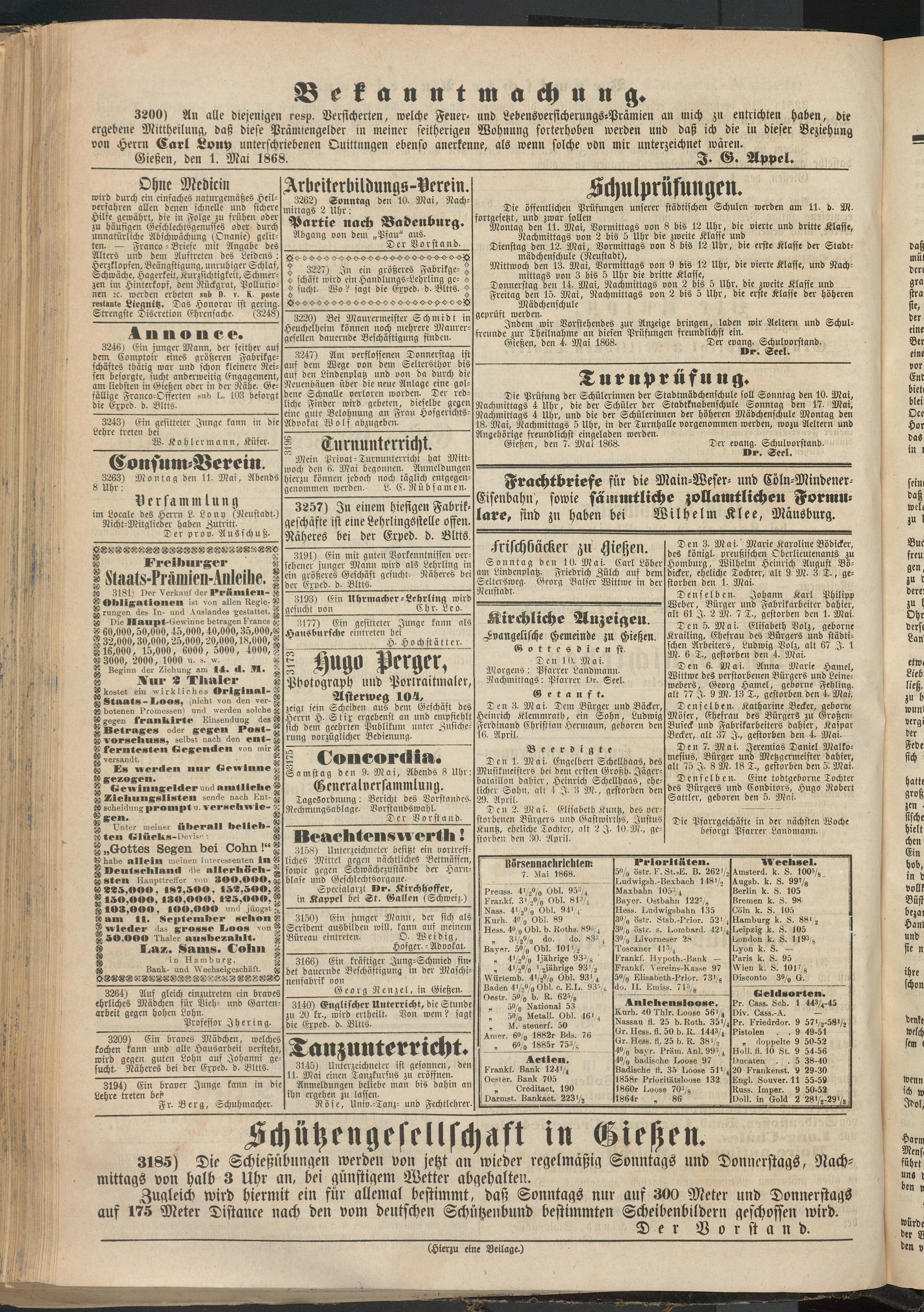 Gießen, den 4. Mai 1868. Der evang. Schulvorstand.