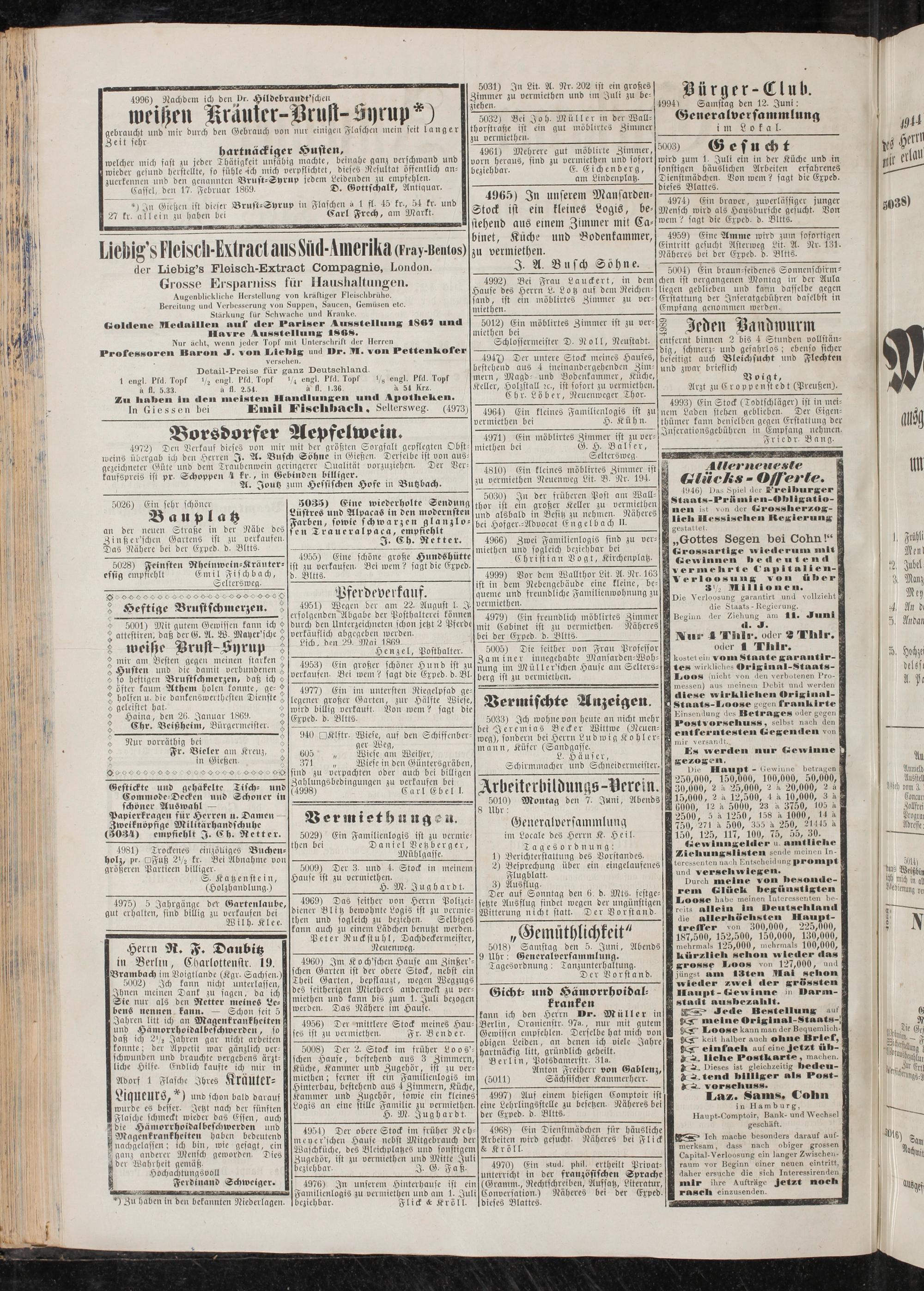 4972) Den Verfauf dieses von mir mit der größten Sorgfalt gepflegten Obst-1 miethen bei weins übergab ich deil Herren I. A. Busch Söhne in Gießen. Derselbe ist von aus-' gezeichneter Güte und dem Traubenwein geringerer Qualität vorzuziehcn. Der Verkaufspreis ist pr. Schoppen 4 fr., in Gebinden billiger.
