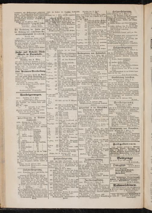 1566) Dienstag den 2. März soll die Wegfuhr der auf den Banquets der Straße von Gießen gegen Nodheim zwischen Ab- theilungsnummer 14 und 19 lagernden Erde wenigstfordernd versteigert und der Anfang Morgens 9 Uhr an Ort und Stelle bei Abtheilungsnummer 14 gemacht werden.