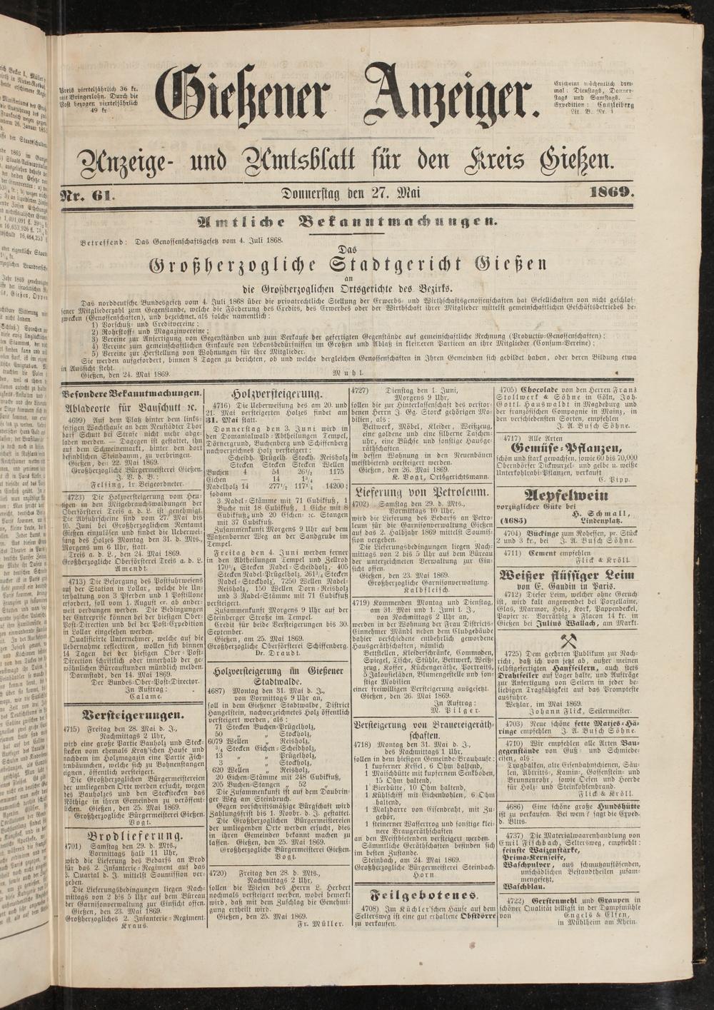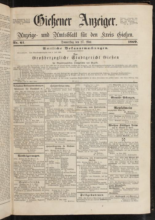 Die Großherzoglichen Bürgermeistereien der umliegenden Orte werden ersucht, dies in ihren Gemeinden bekannt machen zu lassen. Gießen, den 25. Mai 1869.