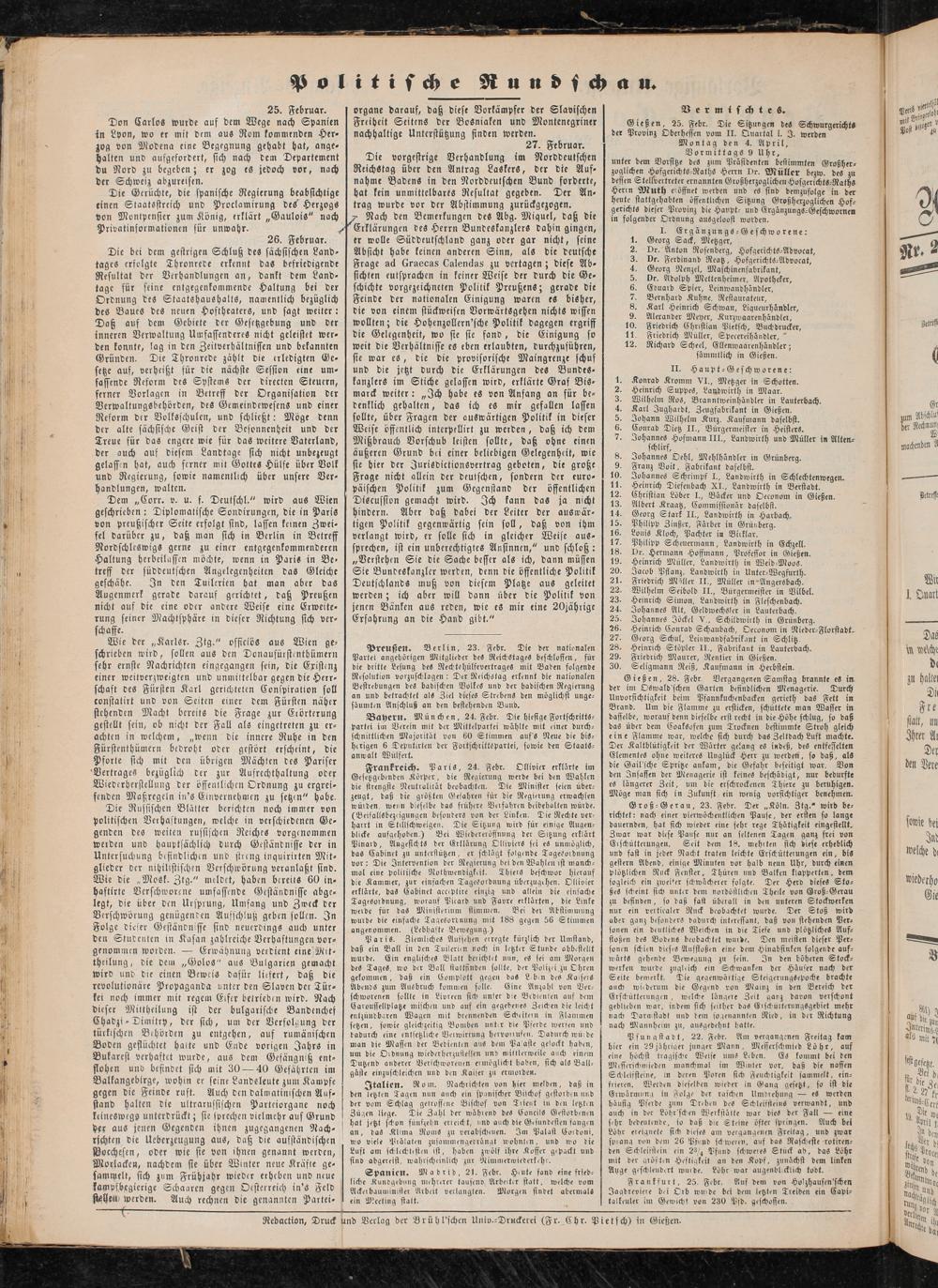 I. Ergänzungs-Geschworene: Georg Sack, Metzger, Dr. Anton Rosenberg, HofgerichtS-Advocat, Dr. Ferdinand Reatz, Hofgerichts-Advocat, Georg Nenzel, Maschinenfabrikant, Dr. Adolph Mettenheimer, Apotheker, Evuard Spier, Leinwandhändler, Bernhard Kühne. Restaurateur, Karl Heinrich Schwan, Liqueurhändler, Alexander Meyer, Kurzwaarenhändler, Friedrich Christian Pietsch, Buchdrucker, Friedrich Muller, Speeereihändler, Richard Scheel, Ellenwaarenhändler; sämmllich in Gießen.