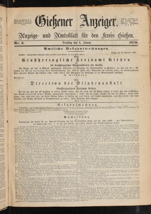 Da wir zur Zeit nur 20'Zöglinge in unserer Anstalt haben, aber für etlich und 30 Raum besitzen, so haben wir uns entschlossen eine Anzahl notorisch armer Blinder unentgeltlich aufzunehmen. Sollte sich ein solcher zwischen 12 und 15 Jahren, dürfte wohl jünger, aber nicht älter sein, im Äreise Gießen finden, so dürften wir wohl bitten, uns solches mitzutheilen, und wir würden uns dann erlauben, mit Großh. Kreisamt in Communication zu treten. Ihrer Nachricht sieht entgegen