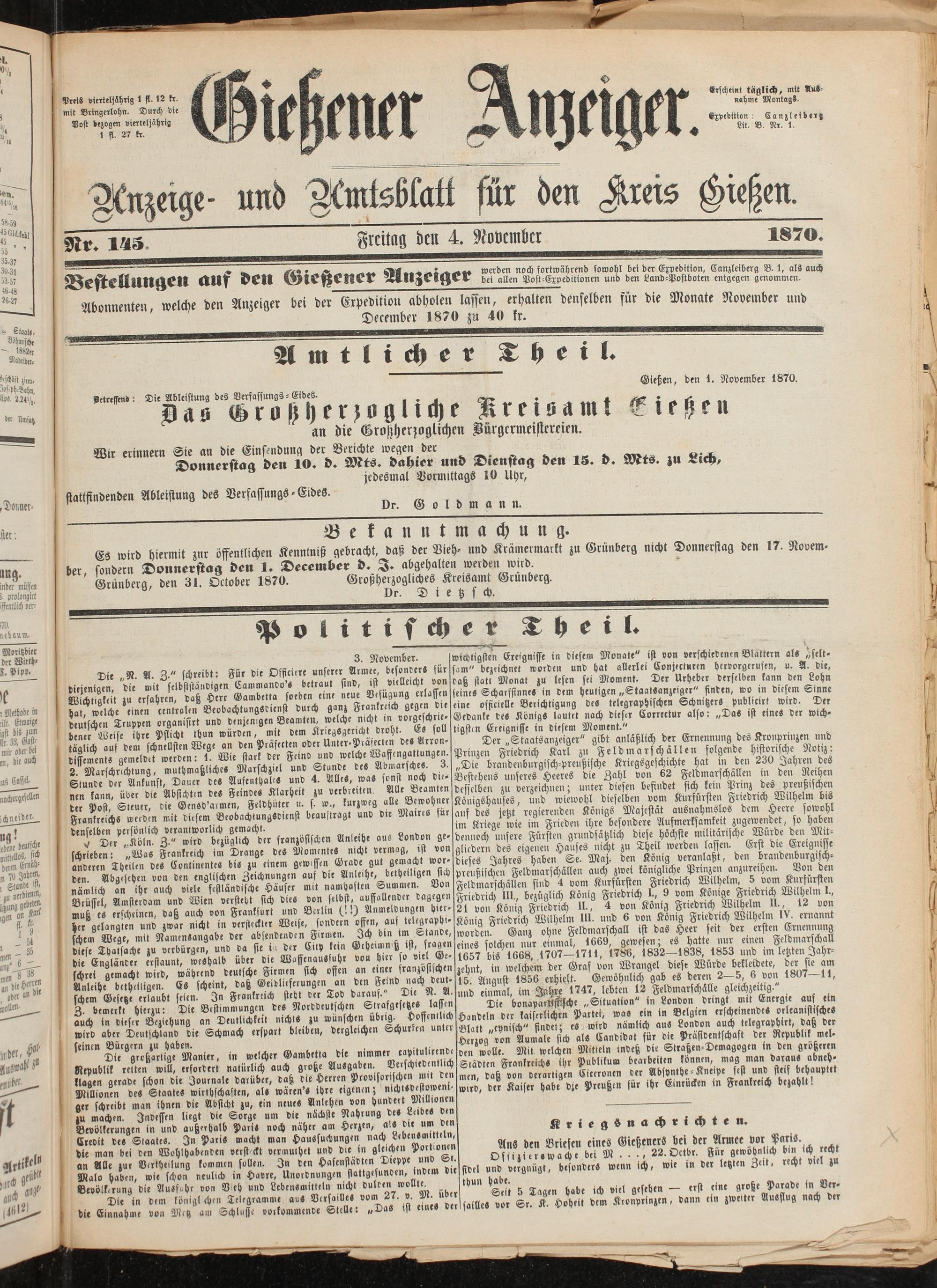 Grünberg, den 31. October 1870. Großherzogliches Krersamt Gcunberg.