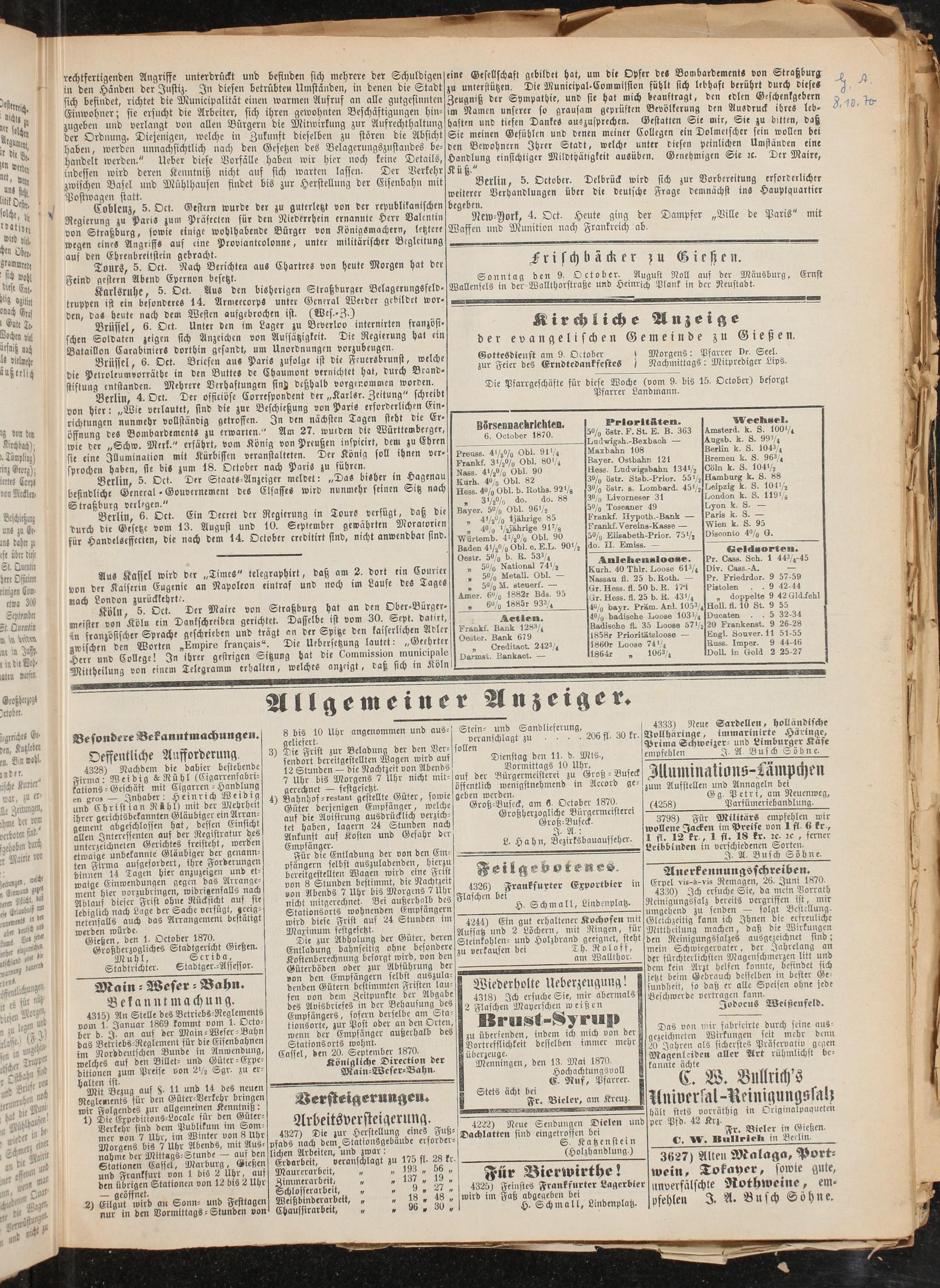 Gießen, den 1- October 1870. Großherzogliches Stadtgericht Gießen.