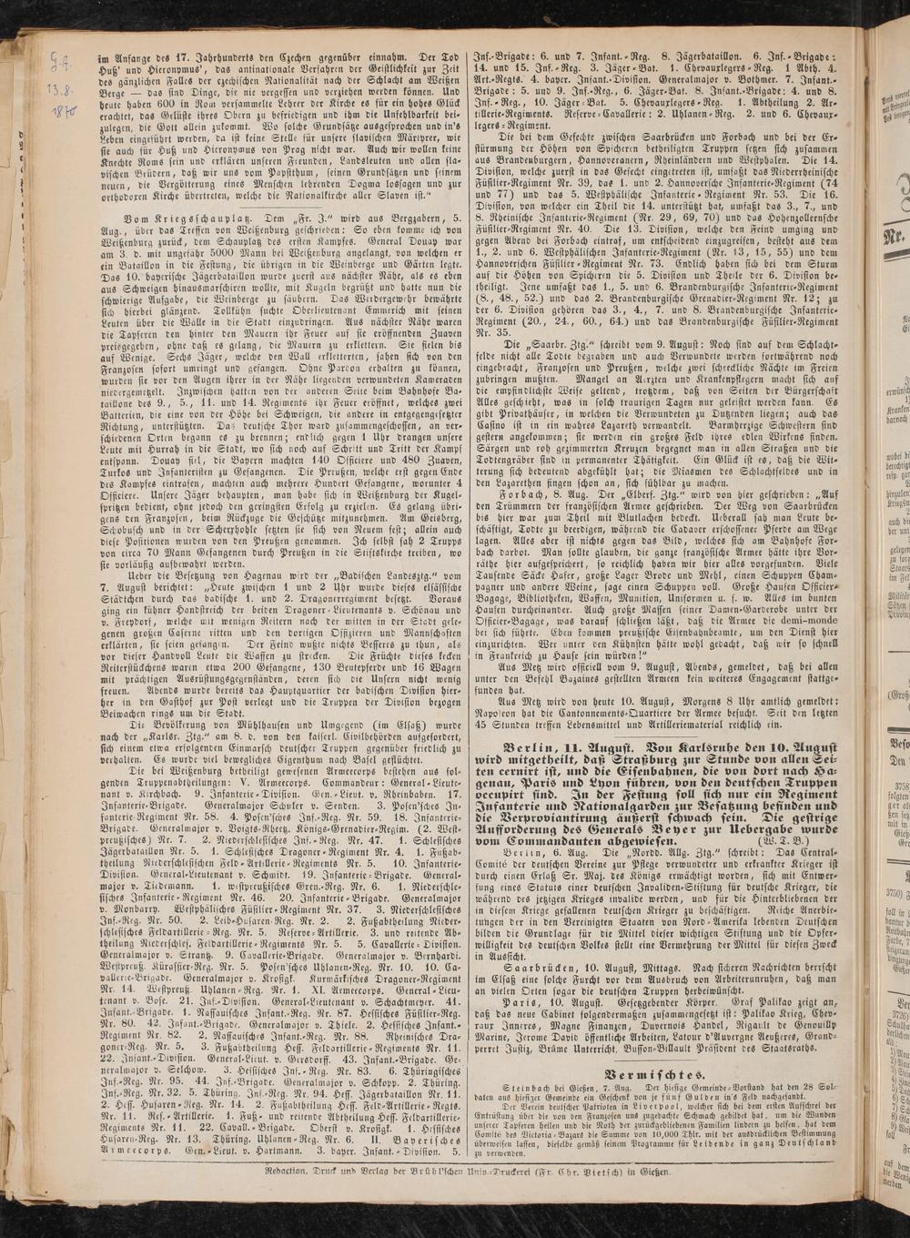 Die bei Weißenburg betheiligt gewesenen Armeecorps bestehen aus folgenden Truppenabtheilungen: V. Armeekorps. Commandeur: General-Lieutenant v. Kirchbach. 9. Infanterie-Division. Gen.-Lieut. v. Rheinbaben. 17. Infanterie-Brigade. Generalmajor Schuler v. Senden. 3. Posen'sches Infanterie Regiment Nr. 58. 4. Posen'sches Jnf.-Reg. Nr. 59. 18. Infanterie- Brigade. Generalmajor v. VoigtS-Rhectz. Königs-Grenadier-Regim. (2. West- preußisches) Nr. 7. 2. Niederschlefisches Inf.»Reg. Nr. 47. 1. Schlesisches