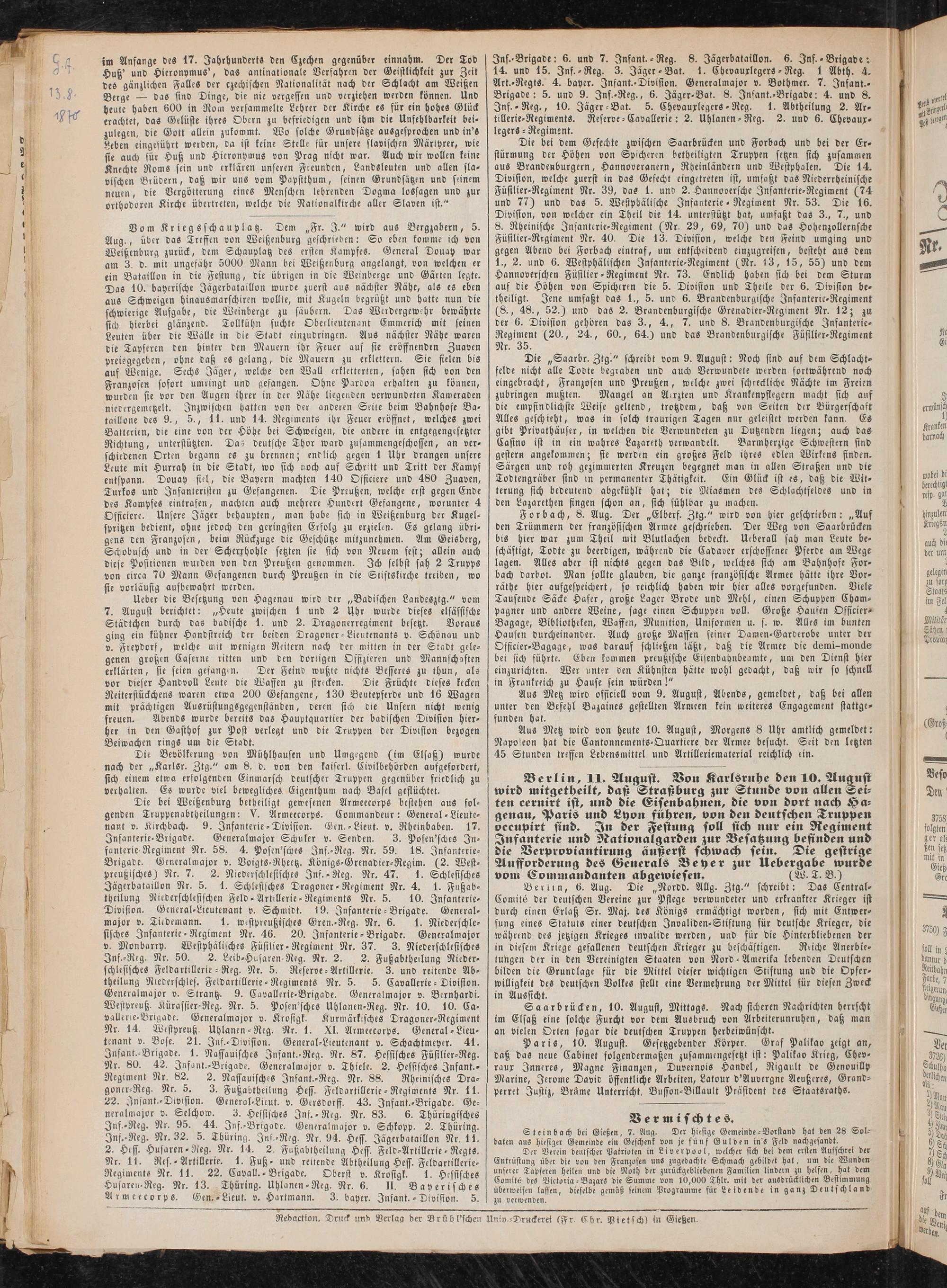 Vom Kriegsschauplatz. Dem „Fr. I." wird aus Bergzabern, 5. Aug., über das Treffen von Weißenburg geschrieben: So eben komme ich von Weißenburg zurück, dem Schauplatz des ersten Kampfes. General Douay war am 3. d. mit ungefähr 5000 Mann bei Weißenburg angelangt, von welchen er ein Bataillon in die Festung, die übrigen in die Weinberge und Gärten legte. Das 10. bayerische Jägerbataillon wurde zuerst aus nächster Nähe, als es eben aus Schweigen hinausmarschiren wollte, mit Kugeln begrüßt und hatte nun die schwierige Ausgabe, die Weinberge zu säubern. Das Werdergewehr bewährte sich hierbei glänzend. Tollkühn suchte Oberlieutenant Emmerich mit seinen Leuten über die Walle in die Stadt einzudringcn. Aus nächster Nähe waren die Tapferen den hinter den Mauern ihr Feuer aus sie eröffnenden Zuaven preiegegeben, ohne daß es gelang, die Mauern zu erklettern. Sie fielen bis auf Wenige. Sechs Jäger, welche den Wall erkletterten, sahen sich von den Franzosen sofort umringt und gefangen. Ohne Paroon erhalten zu können, wurden sie vor den Augen ihrer in der Nähe liegenden verwundeten Kameraden niedergemetzelt. Inzwischen hatten von der anderen Seite beim Bahnhofe Bataillone des 9., 5., 11. und 14. Regiments ihr Feuer eröffnet, welches zwei Batterien, die eine von der Höhe bei Schweigen, die andere in entgegengesetzter Richtung, unterstützten. Da-; deutsche Thor ward zusammengeschossen, an verschiedenen Orten begann es zu brennen; endlich gegen 1 Uhr drangen unsere Leute mit Hurrah in die Stadt, wo sich noch auf Schritt und Tritt der Kampf entspann. Douay fiel, die Bayern machten 140 Osficiere und 480 Zuaven, TurkoS und Infanteristen zu Gefangenen. Die Preußen, welche erst gegen Ende des Kampfes eintrasen, machten auch mehrere Hundert Gefangene, worunter 4 Osficiere. Unsere Jäger behaupten, man habe sich in Weißenburg der Kugel- spritzen bedient, ohne jedoch den geringsten Erfolg zu erzielen. Es gelang übrigens den Franzosen, beim Rückzüge die Geschütze mitzunchmen. Am Geisberg, Schobusch und in der Scherrhohle setzten sie sich von Neuem fest; allein auch diese Positionen wurden von den Preußen genommen. Ich selbst sah 2 Trupps von circa 70 Mann Gefangenen durch Preußen in die Stiftskirche treiben, wo sie vorläufig ausbcwahrt werden.
