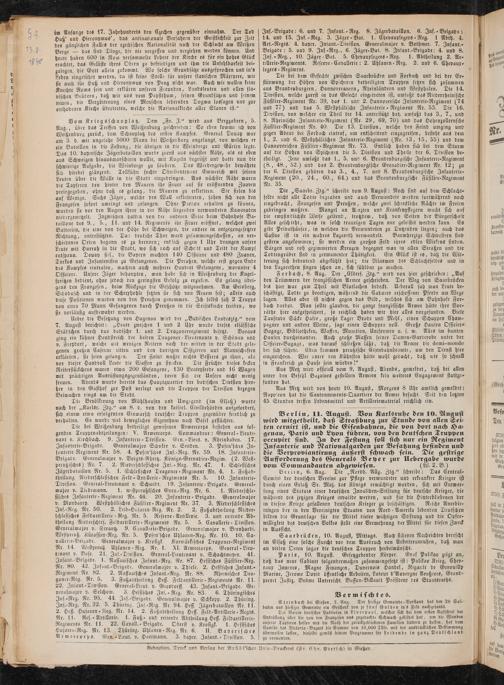 Aus Metz wird von heute 10. August, Morgens 8 Uhr amtlich gemeldet: Napoleon hat die Cantonnements-Quartiere der Armee besucht. Seit den letzten 45 Stunden treffen Lebensrnittel und Artilleriematerial reichlich ein.