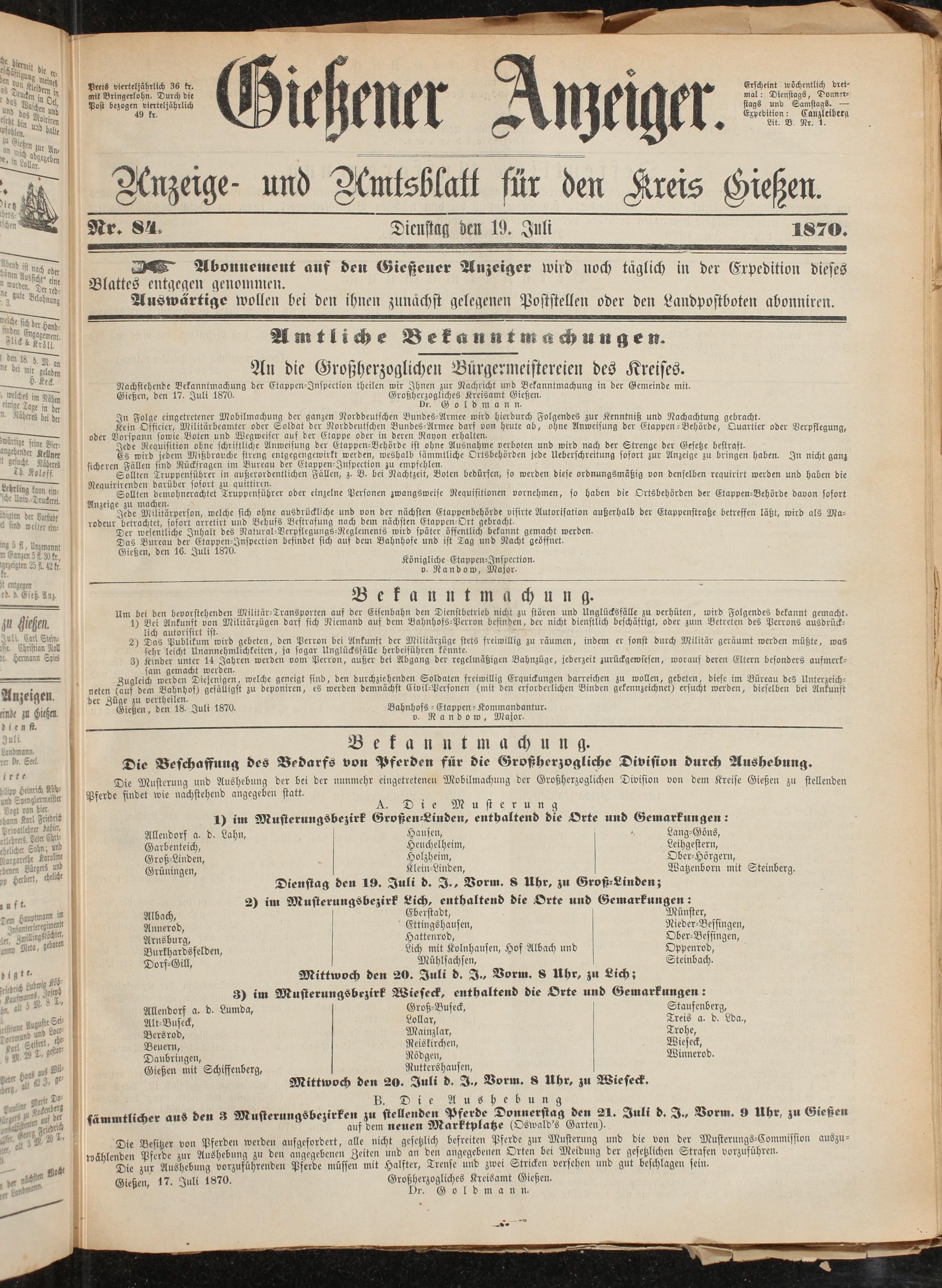 Gießen, den 17. Juli 1870. Großherzogliches Kreisamt Gießen.