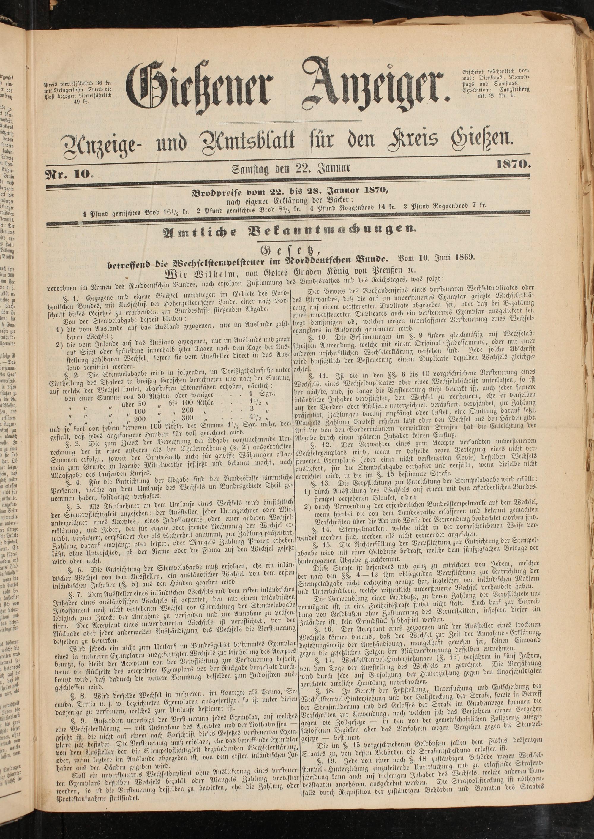 Brodpreife vom 22. bis 28. Januar 1870,