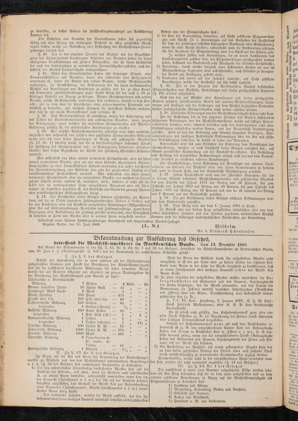 Urkundlich unter Unserer Höchsteigenhändigen Unterschrift und beigedrucktem Vundes-Jnsieael. Gegeben Berlin, den 10. Juni 1869. — —