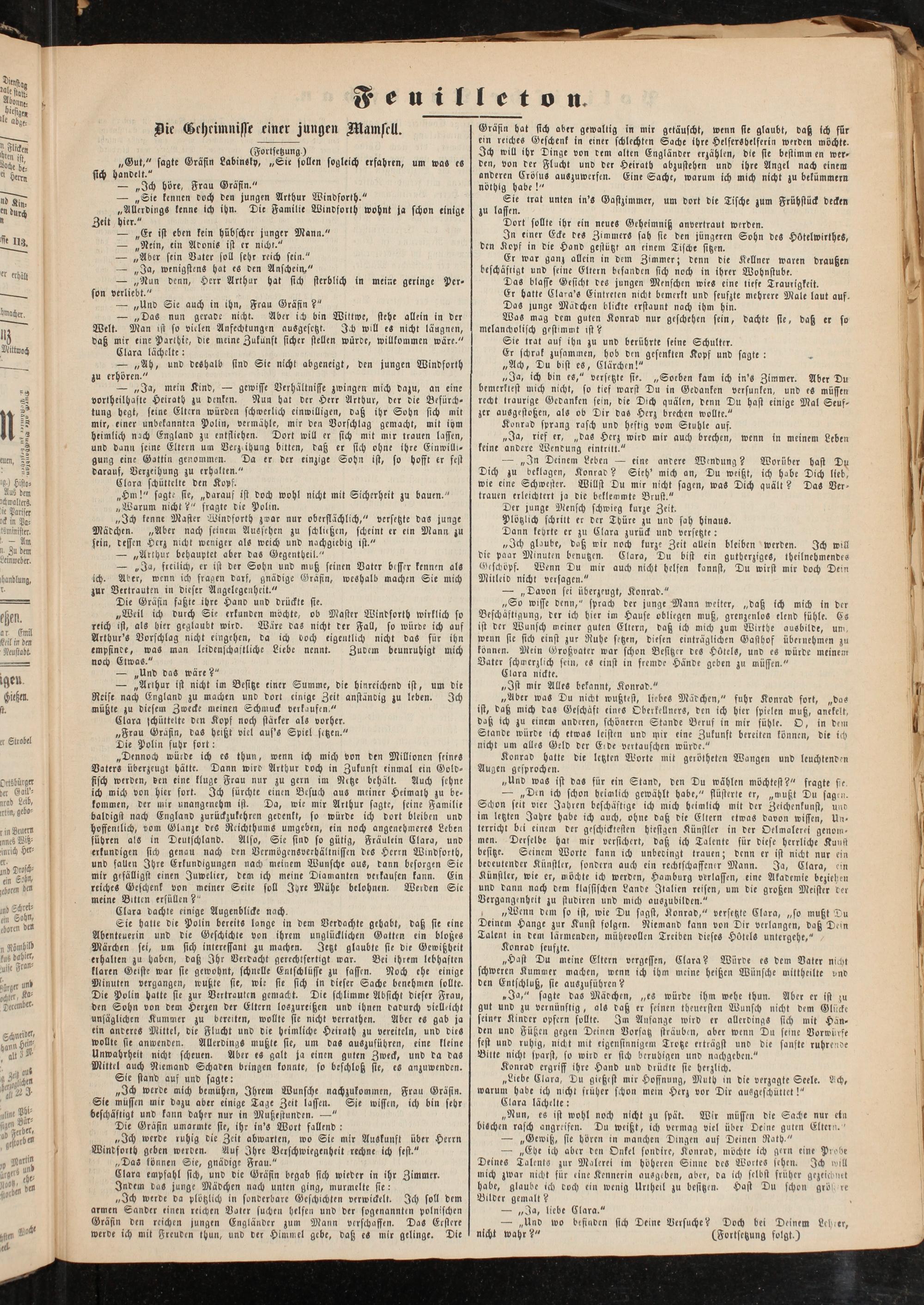„Weil ich durch Sie erkunden möchte, ob Master Windforth wirklich so reich ist, als hier geglaubt wird. Wäre das nicht der Fall, so würde ich auf Arthur'S Vorschlag nicht eingehen, da ich doch eigentlich nicht daS für ihn empfinde, was man leidenschaftliche Liebe nennt. Zudem beunruhigt mich noch Etwas."