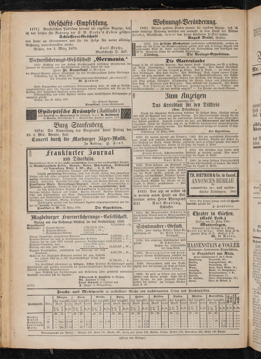 Täglich zweimalige Versendung; nach dem Großh. Hessen, dem ehemaligen Nassau und den näher gelegenen bayerischen und ftüher kurhessischen Orten dreimalige Correspondenzen, Telegramme und Coursnotizen von allen bedeutenden Plätzen. Leitartikel. Politische Uebersicht. Tägliche und Wocken Referate über die frankfurter Börse. VerloosungS-Anzeiger. Markt- und Waarenbertchte rc. Inserate, gerichtliche, industrielle und private, in außergewöhnlicher Zahl.