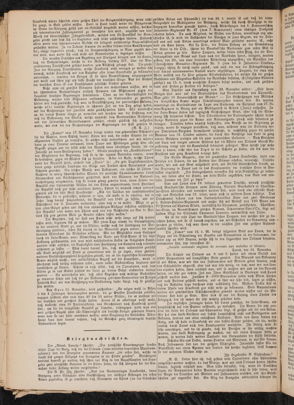 Die N Pr Ztg. schreibt: „Aus den Nordprovinzen Frankreichs, deren siegen, die Verwundeten beider Parteien vergleichsweise nicht so sehr leiden, well Besetzung unter Einnahme oder Einschließung der nothigen Festungen der ersten die Aerzte der Deutschen mit M-dirin und Instrumenten versehen, und ihre Gesell- Armee zugefallen, ist zu erwähnen, daß Montmedp am ChierS (an der Eisenbahn schäften gut orgamsirt find. Em Sieg der Franzosen andererseits bedeutet für