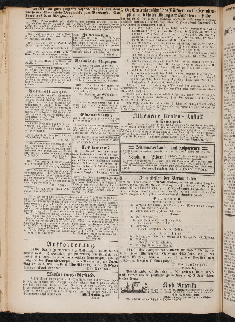 3442) Zum Besten der Verwundeten hat der vor Kurzem hier gehörte Improvisator, Herr Adolf Kühne, seine in Nauheim verfaßten Gedichte veröffentlicht und sind dieselben von heute ab in der Buchhandlung des Herrn Ferber, als auch durch Colportation das Exemplar zu 12 fr. zu haben.