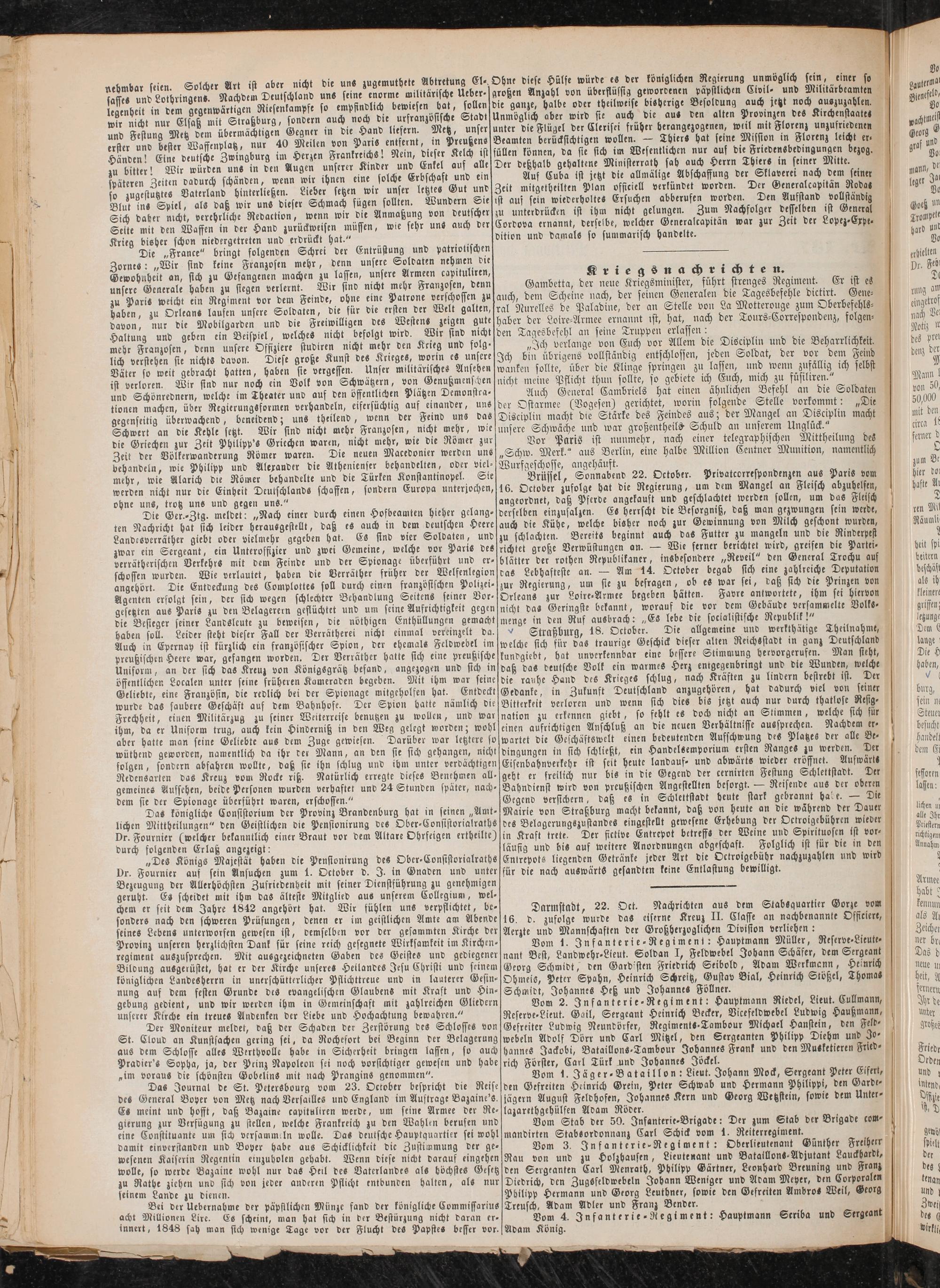 Die „France" bringt folgenden Schrei der Entrüstung und patriotischen Zornes: „Wir sind keine Franzosen mehr, denn unsere Soldaten nehmen die Gewohnheit an, sich zu Gefangenen machen zu lassen, unsere Armeen capituliren, unsere Generale haben zu siegen verlernt. Wir sind nicht mehr Franzosen, denn zu Paris weicht ein Regiment vor dem Feinde, ohne eine Patrone verschossen zu haben, zu Orleans laufen unsere Soldaten, die für die ersten der Welt galten, davon, nur die Mobilgarden und die Freiwilligen des Westens zeigen gute Haltung und geben ein Beispiel, welches nicht befolgt wird. Wir sind nicht mehr Franzosen, denn unsere Offiziere studiren nicht mehr den Krieg und folglich verstehen sie nichts davon. Diese große Kunst des Krieges, worin un(ere Däter so weit gebracht hatten, haben sie vergessen. Unser militärisches Ansehen ist verloren. Wir sind nur noch ein Volk von Schwätzern, von Genußmensichen und Schönrednern, welche im Theater und aus den öffentlichen Plätzen Demonstrationen machen, über Regierungsformen verhandeln, eifersüchtig auf einander, uns gegenseitig überwachend, beneidend; uns theilend, wenn der Feind uns das ....... - f n ,