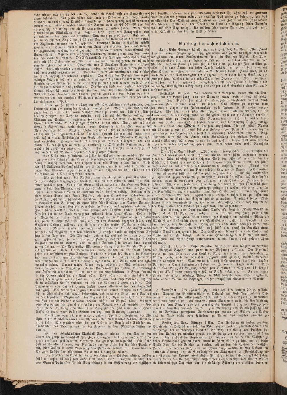 Berlin, 24. Nov., Mittags 1 Uhr. Der Reichstag ist soeben von dem Staatsminister Delbrück mit folgender Rede eröffnet worden: „Geehrte Herren vom Reichstage des norddeutschen Bundes! Se. Maj. Der König von Preußen hat mir Den Auftrag zu ertheilen geruht, Den Reichstag des nordDeutfchen BunDes im Namen Der verbündeten Regierungen zu eröffnen. Es würde Sr. Majestät zu hoher Befriedigung gereicht haben, heute in Ihrer Mitte zu fein, um an Dieser Stelle Gott für Die Erfolge zu Danken, mit welchen Die Waffen Der Deutschen Heere gesegnet worden sind, und um Ihnen auszusprechen, welchen Ankheil die nationale Haltung und die Einmüthigkeit Des Reichstages bei Bereitstellung Der zur Führung Des Krieges erforderlichen Mittel an Diesen Erfolgen gehabt haben. Durch Die in Der Kriegsgeschichte beispiellosen Siege, welche nach Gottes Willen Die helDenmüthige Tapferkeit und die einsichtige Führung Der Deutschen Heere er-