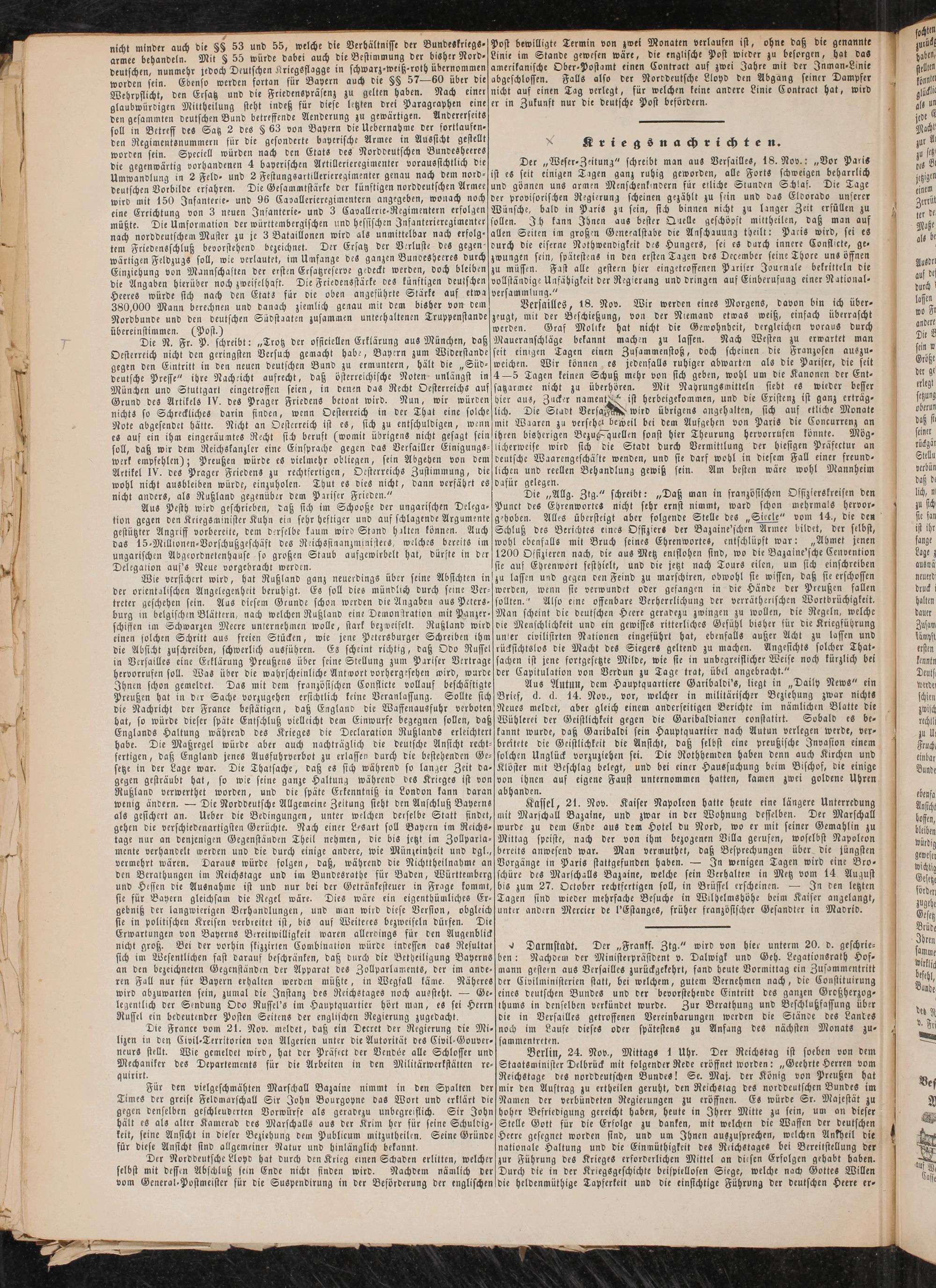 Der „Weser-Zeitung" schreibt man aus Versailles, 18. Nov.: „Vor Pans ist es seit einigen Tagen ganz ruhig geworden, alle Forts schweigen beharrlich und gönnen uns armen Menschenkindern für erliche Stunden Schlaf. Die Tage der provisorischen Regierung scheinen gezählt zu sein und das Eldorado unserer Wünsche, bald in Paris zu sein, sich binnen nicht zu langer Zeit erfüllen zu sollen. Ich kann Ihnen aus bester Quelle geschöpft mittheilen, daß man auf allen Seiten im großen Genesalstabe die Anschauung theilt: Paris wird, sei es durch die eiserne Nothwendigkeit des Hungers, sei es durch innere Conflicte, gelungen sein, spätestens in den ersten Tagen des December seine Thore uns öffnen zu muffen. Fast alle gestern hier eingetroffenen Pariser Journale bekritteln die vollständige Unfähigkeit der Regierung und dringen auf Einberufung einer Nationalversammlung."
