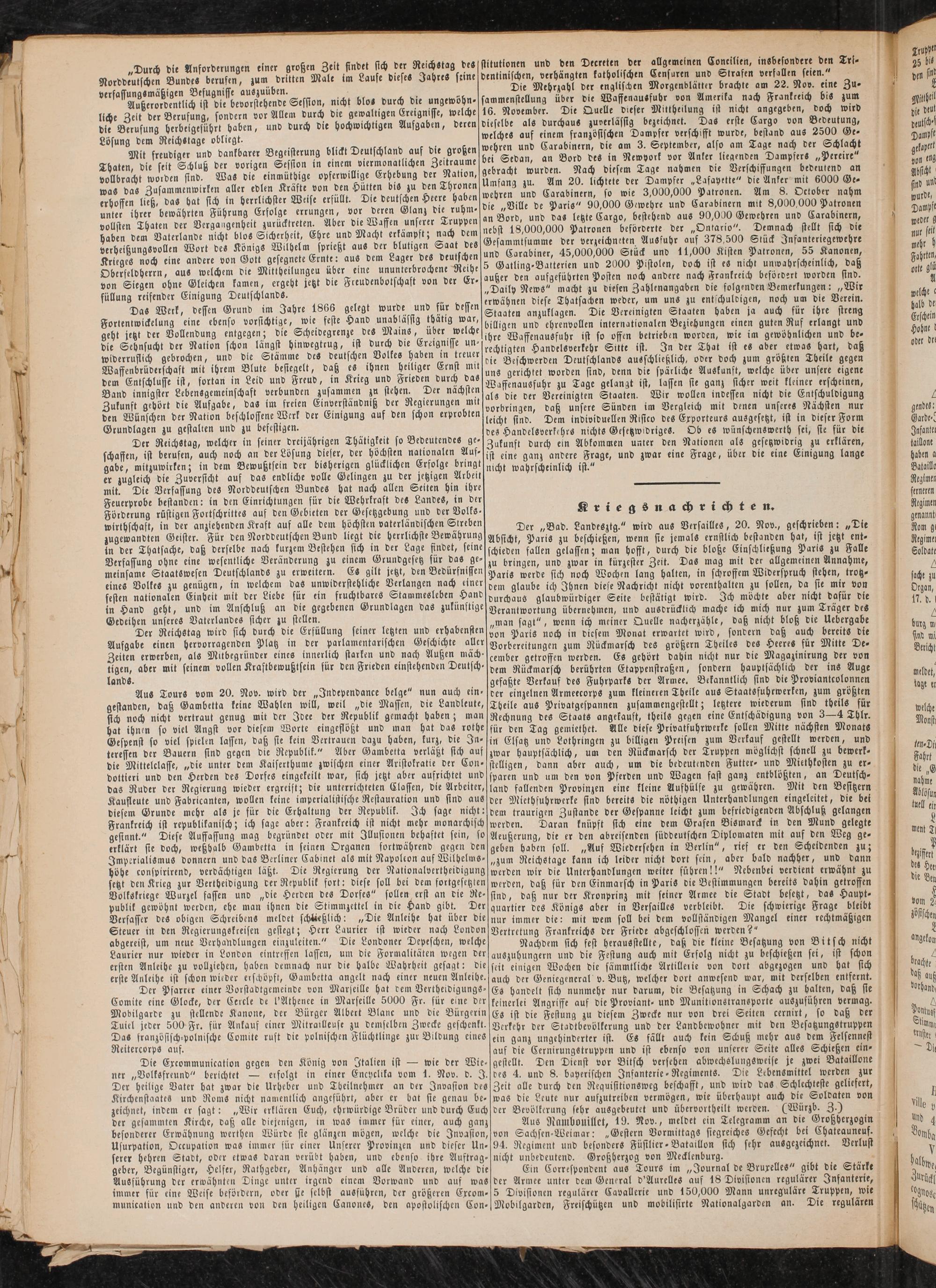 Der „Bad. Landesztg." wird aus Versailles, 20. Nov., geschrieben: „Die Absicht, Paris zu beschießen, wenn sie jemals ernstlich bestanden hat, ist jetzt entschieden fallen gelassen; man hofft, durch die bloße Einschließung Paris zu Falle zu bringen, und zwar in kürzester Zeit. Das mag mit der allgemeinen Annahme, Paris werde sich noch Wochen lang halten, in schroffem Widerspruch stehen, trotzdem glaube ich Ihnen diese Nachricht nicht vorenthalten zu sollen, da sie mir von durchaus glaubwürdiger Seite bestätigt wird. Ich möchte aber nicht dafür die Verantwortung übernehmen, und ausdrücklich mache ich mich nur zum Träger des „man sagt", wenn ich meiner Quelle nacherzähle, daß nicht bloß die Uebergabe von Paris noch in diesem Monat erwartet wird, sondern daß auch bereits die Vorbereitungen zum Rückmarsch des größern TheileS des Heeres für Mitte De- cember getroffen werden. Es gehört dahin nicht nur die Magazinirung der von dem Rückmarsch berührten Etappenstraßen, sondern hauptsächlich der ins Auge gefaßte Verkauf des Fuhrparks der Armee. Bekanntlich sind die Proviantcolonnen der einzelnen Armeecorps zum kleineren Theile aus Staatsfuhrwerken, zum größten Theile aus Privatgespannen zusammengestellt; letztere wiederum sind theils für Rechnung des Staats angekauft, theils gegen eine Entschädigung von 3—4 Thlr. für den Tag gemietet. Alle diese Privatfuhrwerke sollen Mitte nächsten Monats in Elsatz und Lothringen zu billigen Preisen zum Verkauf gestellt werden, und zwar hauptsächlich, um den Rückmarsch der Truppen möglichst schnell zu bewerkstelligen, dann aber auch, um die bedeutenden Futter- und Miethkosten zu ersparen und um den von Pferden und Wagen fast ganz entblößten, an Deutschland fallenden Provinzen eine kleine Aufhülfe zu gewähren. Mit den Besitzern der Miethsuhrwerke sind bereits die nöthigen Unterhandlungen eingeleitet, die bei dem traurigen Zustande der Gespanne leicht zum befriedigenden Abschluß gelangen Frankreich ist republikanisch; ich sage aber: Frankreich ist nicht mehr monarchisch werden. Daran knüpft sich eine dem Grafen Bismarck in den Mund gelegte gesinnt." Diese Auffassung mag begründet oder mit Illusionen behaftet sein, so Aeußerung, die er den abreisenden süddeutschen Diplomaten mit auf den Weg ge- erklärt sie doch, weßhalb Gambetta in feinen Organen fortwährend gegen den geben haben soll. „Auf Wiedersehen in Berlin", rief er den Scheidenden zu; Imperialismus donnern und das Berliner Cabinet als mit Napoleon auf Wilhelms- „zum Reichstage kann ich leider nicht dort fein, aber bald nachher, und dann höhe confpirirend, verdächtigen läßt. Die Regierung der Nationalvertheidigung werden wir die Unterhandlungen weiter führen!!" Nebenbei verdient erwähnt zu fetzt den Krieg zur Vertheidigung der Republik fort: diese soll bei dem fortgesetzten werden, daß für den Einmarsch in Paris die Bestimmungen bereits dahin getroffen Volkskriege Wurzel fassen und „die Herden des Dorfes" sollen erst an die Re- sind, daß nur der Kronprinz mit seiner Armee die Stadt, besetzt, ^das Haupt- publik gewöhnt werden, ehe man ihnen die Stimmzettel in die Hand gibt. Der quartier des Königs aber in Versailles verbleibt. D' '' ' ? **'