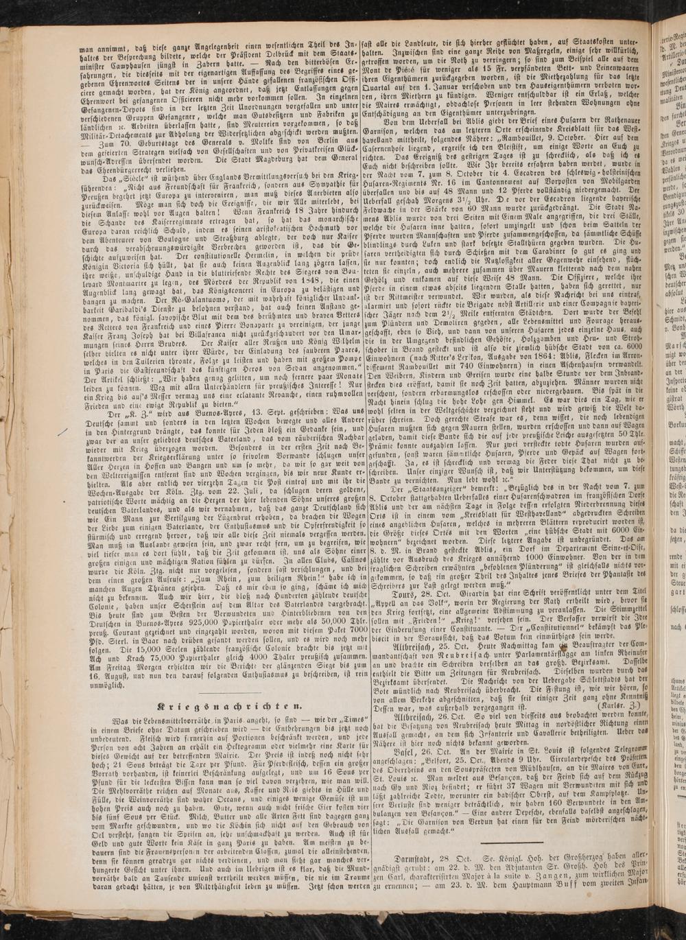 Von dem Uebersall bei AbliS giebt der Brief eines Husaren der Rathenauer Garnison, welchen das am letzteren Orte erscheinende Kreisblatt für das West. Havelland mittheilt, folgendes Nähere: „Rambouillet, 9. Oclober. Hier auf dem Casernenhofe liegend, ergreife ich den Bleistift, um einige Worte an Euch zu richten. Das Ereigniß des gestrigen Tages ist zu schrecklich, als daß ich et Euch nicht beschreiben sollte. Wie Ihr bereits erfahren haben werdet, wurde in ver Nacdt vom 7. zum 8. Oetober die 4. Escadron des schleswig-holsteinischen Husaren-Regiments Nr. 16 im Cantonnement auf Vorposten von Mobilgarden überfallen und bis auf 48 Mann und 12 Pferde vollständig niedergemacht. Der Uebersall geschah Morgens 3*/2 Uhr. D e vor der Escadron liegende bayerische Feldwache in der Stärke von 60 Mann wurde zurückgedrängt. Die Stadt Na- mens Ablis wurde von drei Seiten mit Einem Male angegriffen, die drei Ställe, welche die Husaren inne hatten, sofort umzingelt und schon beim Satteln der Pferde wurden Mannschaften und Pferde zusammengeschoffen, da sämmtliche Schüsse blindlings durch Luken und stark besetzte Stallthüren gegeben wurden. Die Hu. saren vertheidigten sich durch Schießen mit dem Carabiner so gut es ging und sie nur konnten; doch endlich die Nutzlosigkeit aller Gegenwehr einsehend, fluch, teten sie einzeln, auch mehrere zusammen über Mauern kletternd nach dem nahen Gehölz und entkamen auf diese Weise 48 Mann. Die Offiziere, welche ihre Pferde in einem etwas abseits liegenden Stalle hatten, haben sich gerettet , nur ist per Rittmeister verwundet. Wir wurden, als diese Nachricht bei uns eintraf, alarmirt und sofort rückte die Brigade nebst Artillerie und einer Compagnie bayeri. scher Jäger nach dem 2i/2 Meile entfernten Städtchen. Dort wurde der Befehl zum Plündern und Demotiren gegeben, alle Lebensmittel und Fourage heraus- geschafft, eben so Vieh, und bann von unseren Husaren jedes einzelne Haus, auch die in der Umgegend befindlichen Gehöfte, Holzgamben und Heu» und Stroh.