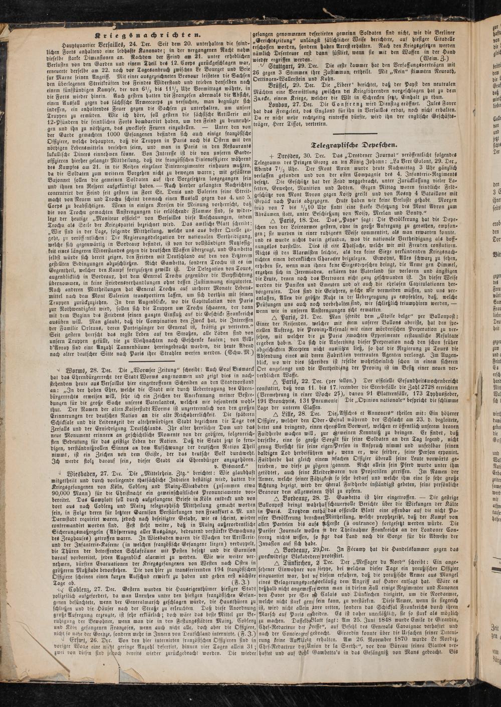 -4 Wiesbaden, 27. Dec. Die „Mittelrhein. Zlg." berichtet: Wie glaubhaft getödtet, auch seine Kleiderwaren von Projektilen zerrissen. Im Namen der mitgetheilt und durch vorliegende thatsächliche Jndicien bestätigt wird, hatten die Armee, welche seiner FähigkeiN so sehr bedarf unv welche ihm eine so sehr große Kriegsgefangenen von Köln, Coblenz und Mainz-Wiesbaden (zusammen etwa Achtung bezeigt, wird der Gerat Faidherbe inständigst gebeten, seine persönliche 90,000 Mann) für die Christnacht ein gemeinschaftliche- Pronunciamento vor- Bravour dem allgemeinen 2)hl zu opfern.