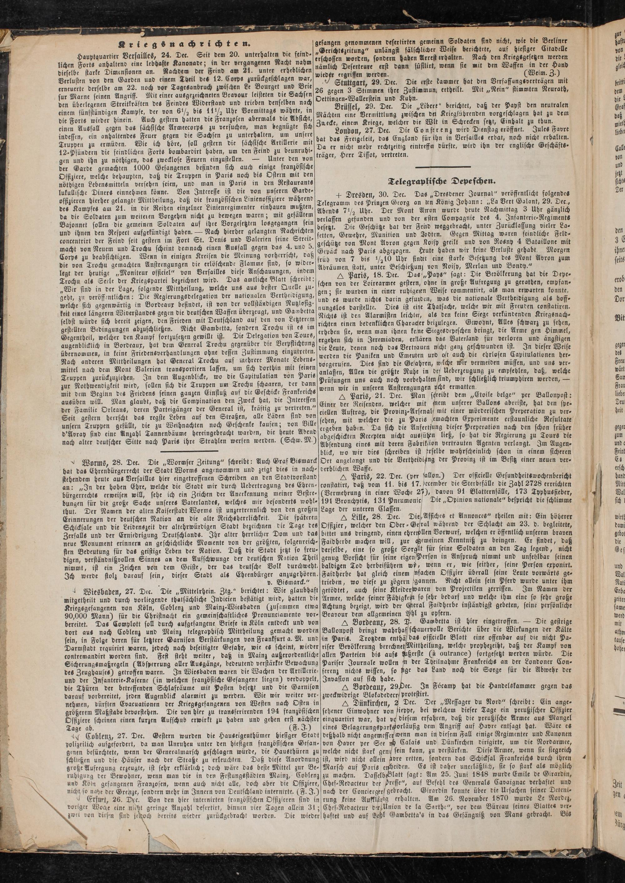 < Worms, 28. Dee. Die „Wormser Zeitung" schreibt: Auch Graf Bismarck Ort angelangt und die Vertheidijtng ver Provinz ist im Besitz einer neuen ver- hat da-Ehrenbürgerrecht ver Stabt Worm- angenommen unv zeigt dies in nach- 9rRnff(>