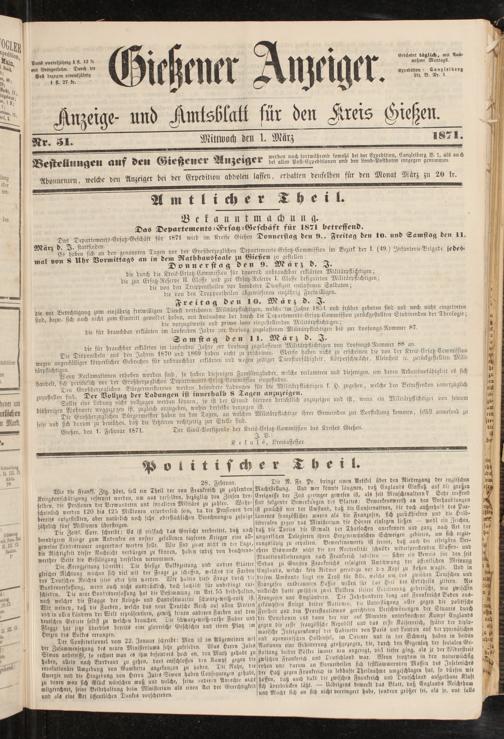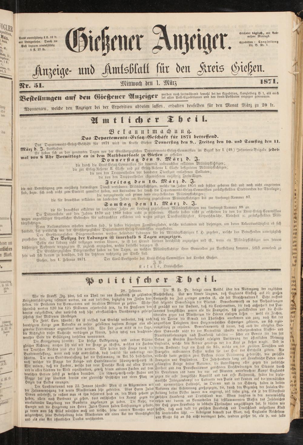 Das Departements-Ersatz-Geschäft für 1871 wird im Kreise Gießen Donnerstag den !>., Freitag den 10. und Samfiag den 11. Mär; b. I. stattfindm. Eten Tagen vor der Größtmöglichen Departements-Ersatz-Commission im Bezirk der I. (49.) Infanterie-Brigade jedesmal von 8 Uhr Dormitlags an in dem Rathhaussaale zu <Srefen stell en