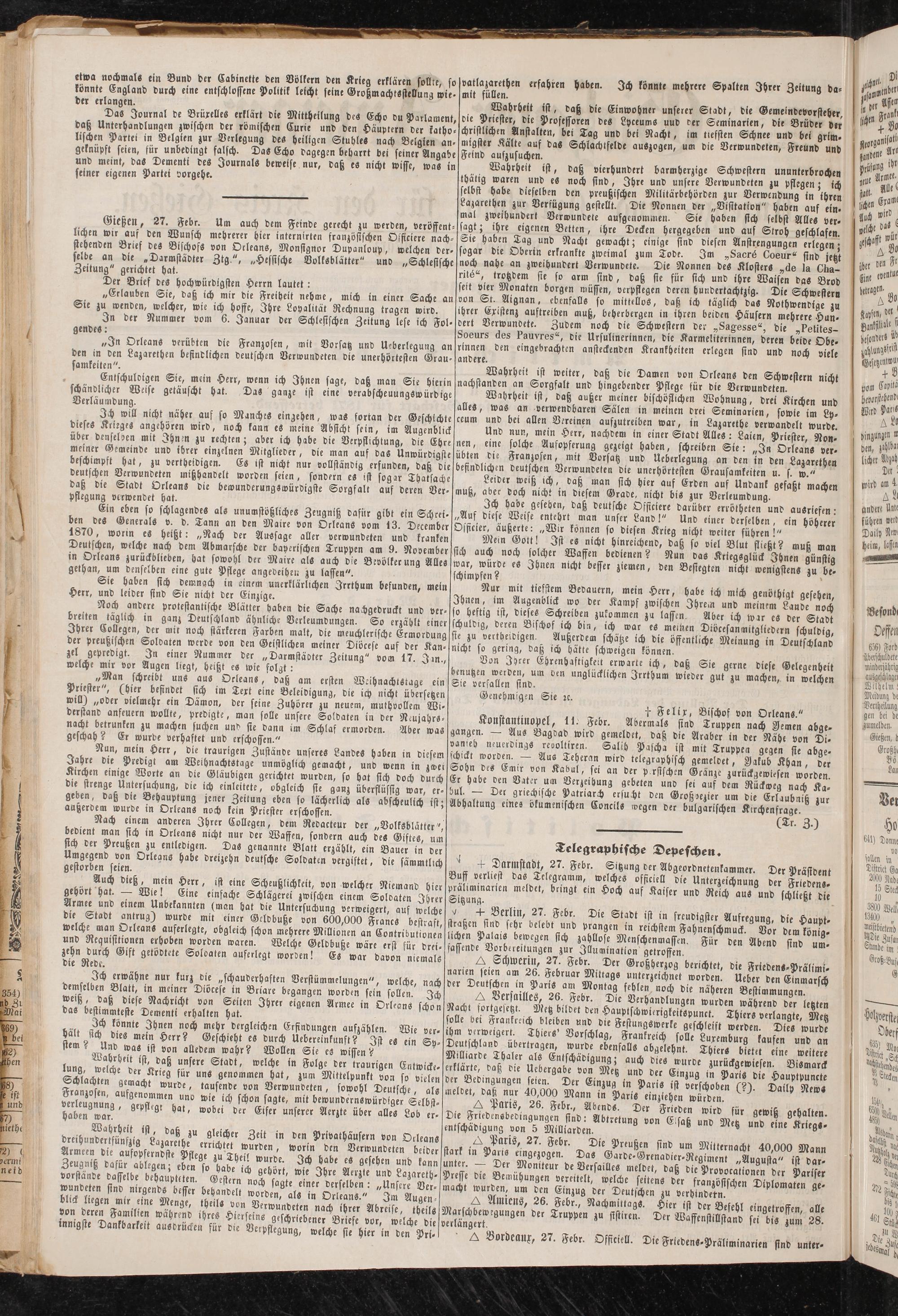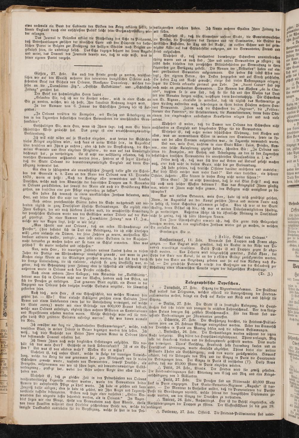 Gießen, 27. Febr. Um auch dem Feinde gerecht zu werden, veröffentlichen wir aus den Wunsch mehrerer hier internirten französischen Oificiere nachstehenden Brief des Bischofs von Orleans, Monsignor Dupanloup, welchen der- selbe an die „Darmstädter Ztg", „Hessische Volksblätter" und „Schlesische Zeitung" gerichtet hat. 1 w