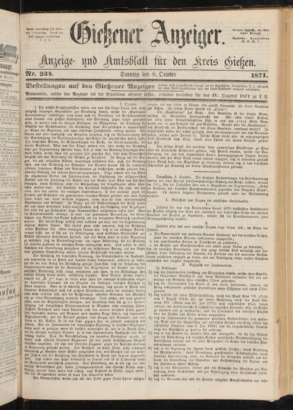 Di- .Constitution" hat Recht. Herr Garnbrtta ist der einzige Mann, welchen die Revolution h-rvorgrbrocht hat. Mit allen seimn Fehlern, mit allen feinen Gewaltthategkeiten flößt er uns von einer Seite Sym- pa h,e -,n : er war Fean.ofe bis zum Wahnflnn. Glaubt aber die „Constitution" daß Frankreich die Prastventfchaft des Herrn Gambetta annehmen würde? st» diesem Falle haben wir nichts zu sagen, denn wir verneigen uns vor dem National- wellen, w- cher unser Princep ist Welche Wahl bl-ibt aber im entgegengesetzten ttrt ist? n°4 ubr'g, sobald Herr Thier« mit seinem Versuche g-stz-j. ... ®fr ^eilige ®,u^* hat neuestens beim auswärtigen Ministerium in Wien über d.e Hendernisse Beschme.de gesühet, resp. Protest erhoben, welche der Ver" kündtgung ter au« dem ocum-nisch-n Concck hervorgegange-.en Dogma bereitet wurden, und hat Gras Beust daraus einfach entgegnet, baß er seinerseits zunächst “”tn „,n*a8 b°be, den Gegenstand zu discutiren, sondern daß er da« betreffende Schriftstück zur Kcnntniß der beiden Ministerpräsidenten gebracht.