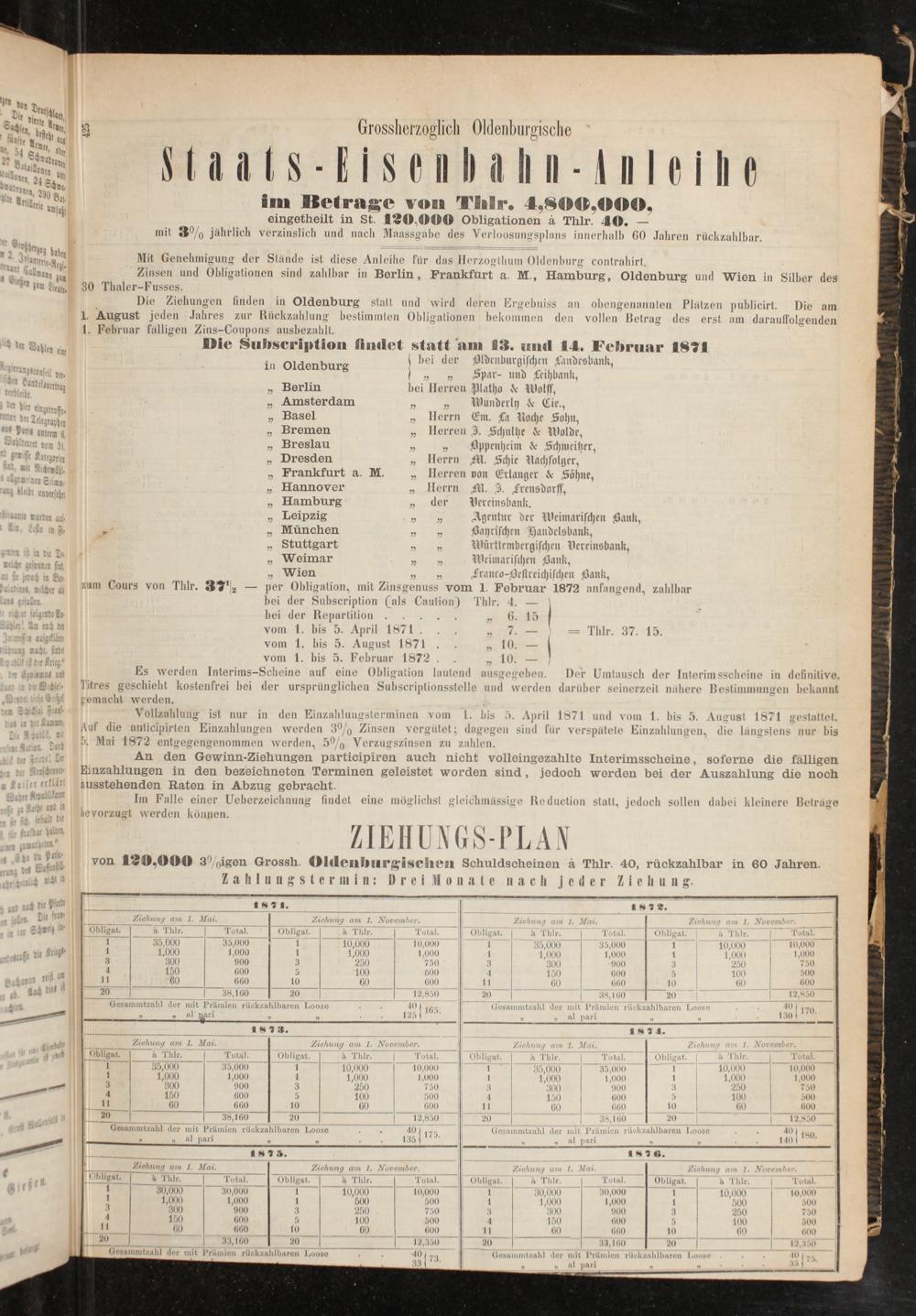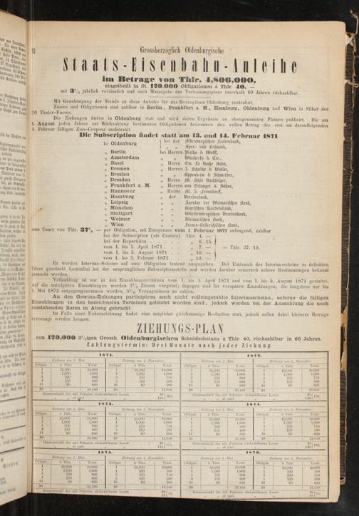 Zinsen und Obligationen sind zahlbar in Berlin, Frankfurt a. M., Hamburg, Oldenburg und Wien in Silber des Thaler-Fusses.