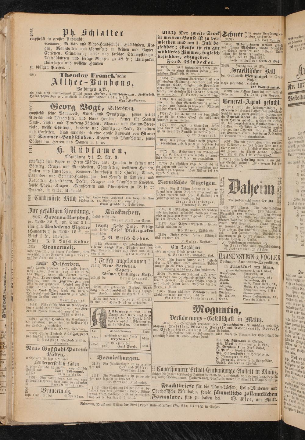 2109) Ein Stückchen Leinwand u. s. w. ist auf dem letzten Gießener Jahrmarkt gefunden worden und gegen Erstattung der Jnseratgebühren abzuholen bei