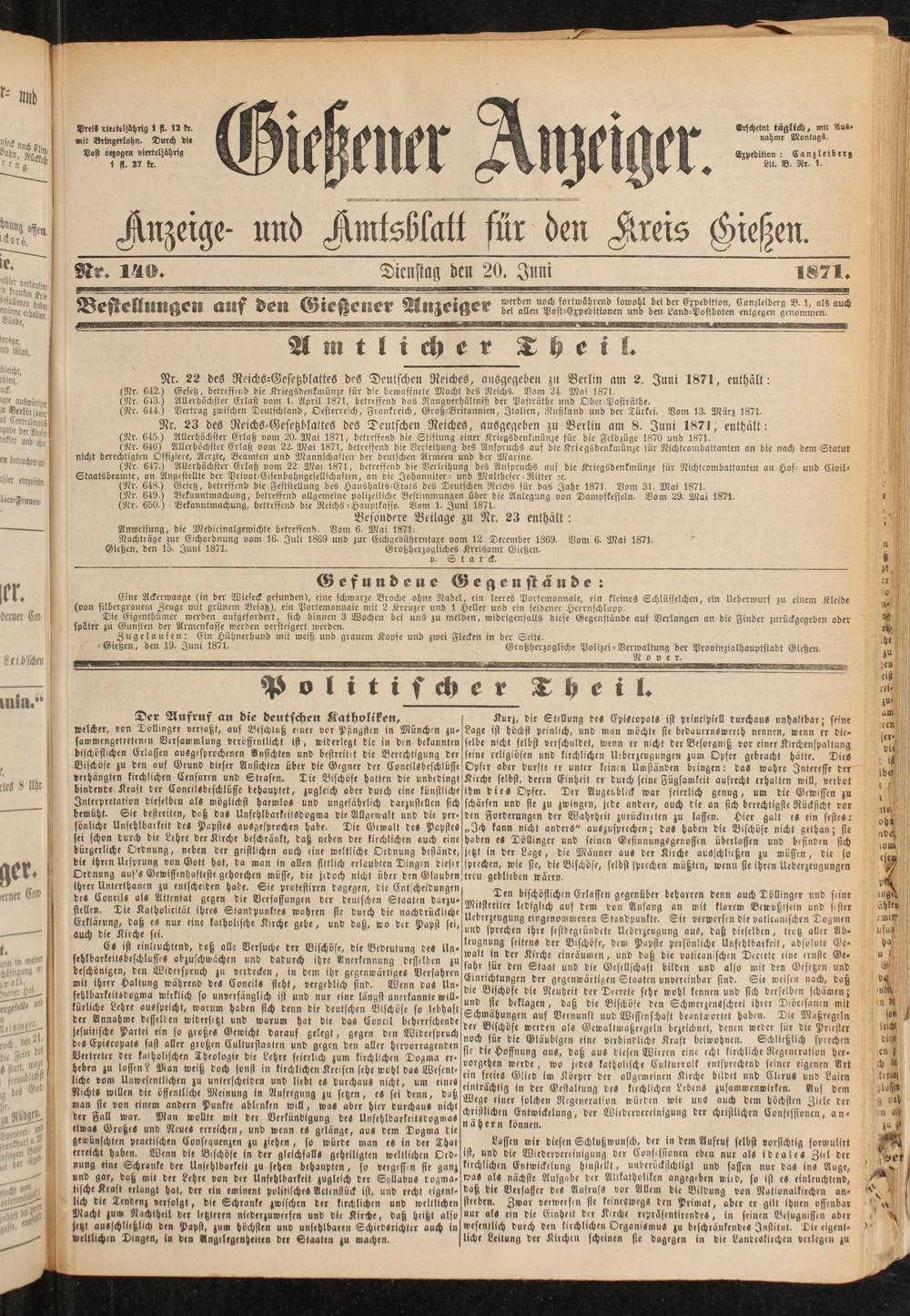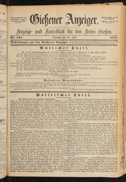 Gießen, den 15. Juni 1871. Großherzogliches Kreisamt Gießen.