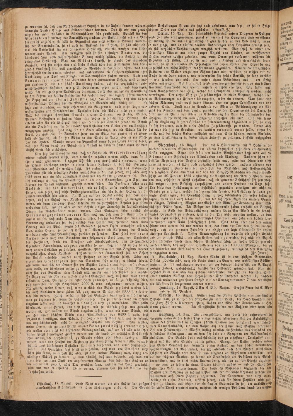 zu erwarten sei, Latz von Norddeutschland Besucher in die Anstalt kommen würden, immerhin könnten Einige aus Süvdeutschland kommen. Das ist mir nun gerade wegen der vielen Anstalten in Süddeuischland sehr zweifelhaft. Speciell für den Staatsdienst vermag des Commissionsgutachten die Anstalt nicht als ein Betz ürfniß anzusehcn, sie hält im Gegentherl eine recht vielseitige Bildung nament- lich der Staatstechniker, sei es auch im Ausland, für räthlich, sie hält nicht ein- mal die Universität für ein dringendes Bedürfnitz, wie viel weniger eine kleine concurrirenve Anstalt. Am wenigsten hält sie für diejenigen Staatsdiener, die überhaupt keine volle wissenschaftliche Bildung nöthig hätten, die Anstalt für ein dringendes Bedü-fniß. Was das Militär betrifft, so glaubt das Gutachten ebenfalls, daß für dieses eine realistische Anstalt über den Realschulen kein dringendes Bedürfnitz sei, weil eineötheils die Realschulen dasjenige leisten, was vaS PortepeefäynvrichSexamen erfordert, und anderntheilS die OsfijierSaspiranten ihre Ausbildung zum Theil auf Kriegs- und Cavettenfchulen suchen werden. Auch von Landwirt h en erwartet das Gutachten keinen bedeutenden Besuch, weil diejenigen Lanowirthe, Vie die höchste Ausbildung suchen, auf die vorzüglichen land- wirthschaftlichen Anstalten, wie z. B. Hohenheim, gehen werden und diejenigen» welche sich mit geringerer Ausbildung begnügen, durch ihre mangelnde Vorbildung in den Lehren der Hilfswissenschaften die Schule wohl mannigfach stören werden. In Bezug auf die übrige Industrie sagt das Gutachten, datz eine höhere wissenschaftliche Bildung für die Mehrzahl der Gewerbe nicht nöthig sei, — so sagt vaS Gutachten, — mehr erforderten die Baugewerbe, noch mehr Jngenieur- wiffenschasten und Maschinenbau; Apotheker habe die Schule nicht zu erwarten. Auch die übrigen chemischen Gewerbe niederer Ordnung, wie Ferber, Gerber, Brauer, Seifensieder rc. suchten selten eine höhere wissenschaftliche Bildung. Es erkennt aber für die Mehrzahl Vieser wie der übrigen Gewerbe gerade die Schule als ein Bedürfnitz an, da die inländischen Anstalten von Bielen den ausländischen vorgezogen würden. Das mag für die Stadt allerdings, wo die Schule sich be- findet, der Fall sein, für Einwohner jeder andern Stadt des Landes ist es jedenfalls gleichgültig, ob sie ihre Söhne in eine Stadt im Lande oder in ein Nachbarland schicken. Manche werden tm Gegentheil einen hohen Werth darauf legen, dasi ihre Söhne durch den Besuch einer Anstalt in anderem Lande einen weiteren Gesichtskreis sich verschaffen.