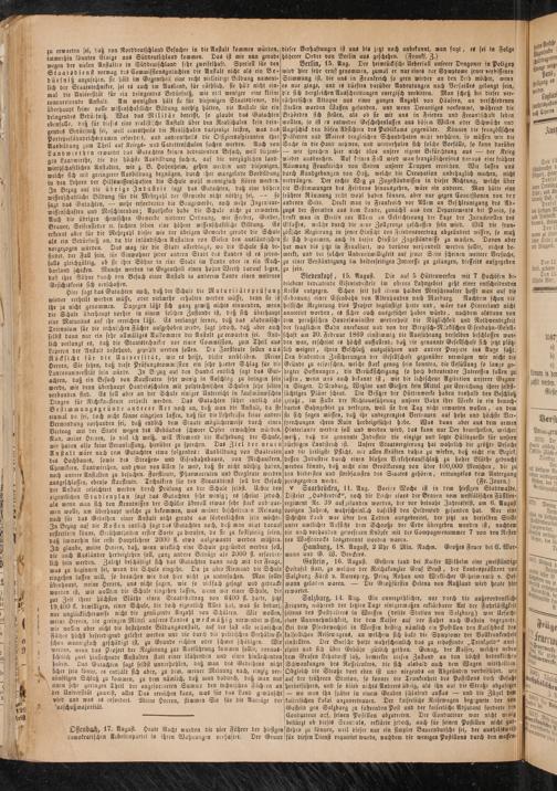 Salzburg, 14. Aug. Ein unverzeihlicher, nur durch die außerordentliche Frequenz während der letzten Tage einigermaßen erklärbarer Act Der Fahrlässigkeit seitens des Posthalters in Werffen (dritte Station von Salzburg) war Ursache einer Unannehmlichkeit, die Dem Kaiser auf Der Fahrt nach Gastein begegnete. Bei dem Pferdewechsel in Werffen bestieg nämlich (in Postillon den Kutschbock des kaiserlichen ReisewagenS, an welchem sich bald die Symptome Der Vollkrunkenheit einstellten. Der Bursche hatte wahrscheinlich das zu erhoffende „Trinkgeld" anti- cipirt und sich über Gebühr gütlich gethan. Genug, der Kaiser, welcher neben dem Grafen Lehnvorff saß, bemerkte diesen Zustand an den höchst bedenklichen Schwankungen des Roffelenkers, die sich alsbald auch dem Wagen mittheilten. Obgleich die Straße dort eben ist uno nirgends an Abgründen vorbeiführt, wie auf der früheren Station, so konnte Vie Trunkenheit des Postillons doch Gefahr herbeiführen, und so blieb nichts Anderes übrig, als ihn auf die Straße abzusetzen — wo man ihn später in einem Graben schlafend auflas — und die Zügel dem kaiserlichen Lakai anzuvertrauen. Der kaiserliche Rcisewagen begegnete der von Gastein gen Salzburg zu fahrenden Post und Der kaiserliche Adjutant forderte Den ConDucteur auf, seinen Postillon abzutreten. Der Convucteur war nicht wenig bestürzt ob dieses Scan'.als, erklärte jedoch, auch für seinen Postillon nicht gutstehen zu können, weil dieser nur ein simpler Bauernbursche sei, Der aushilfsweise für diesen Dienst requirirt wurde, nachdem Die wenigen Postillons durch den massen-