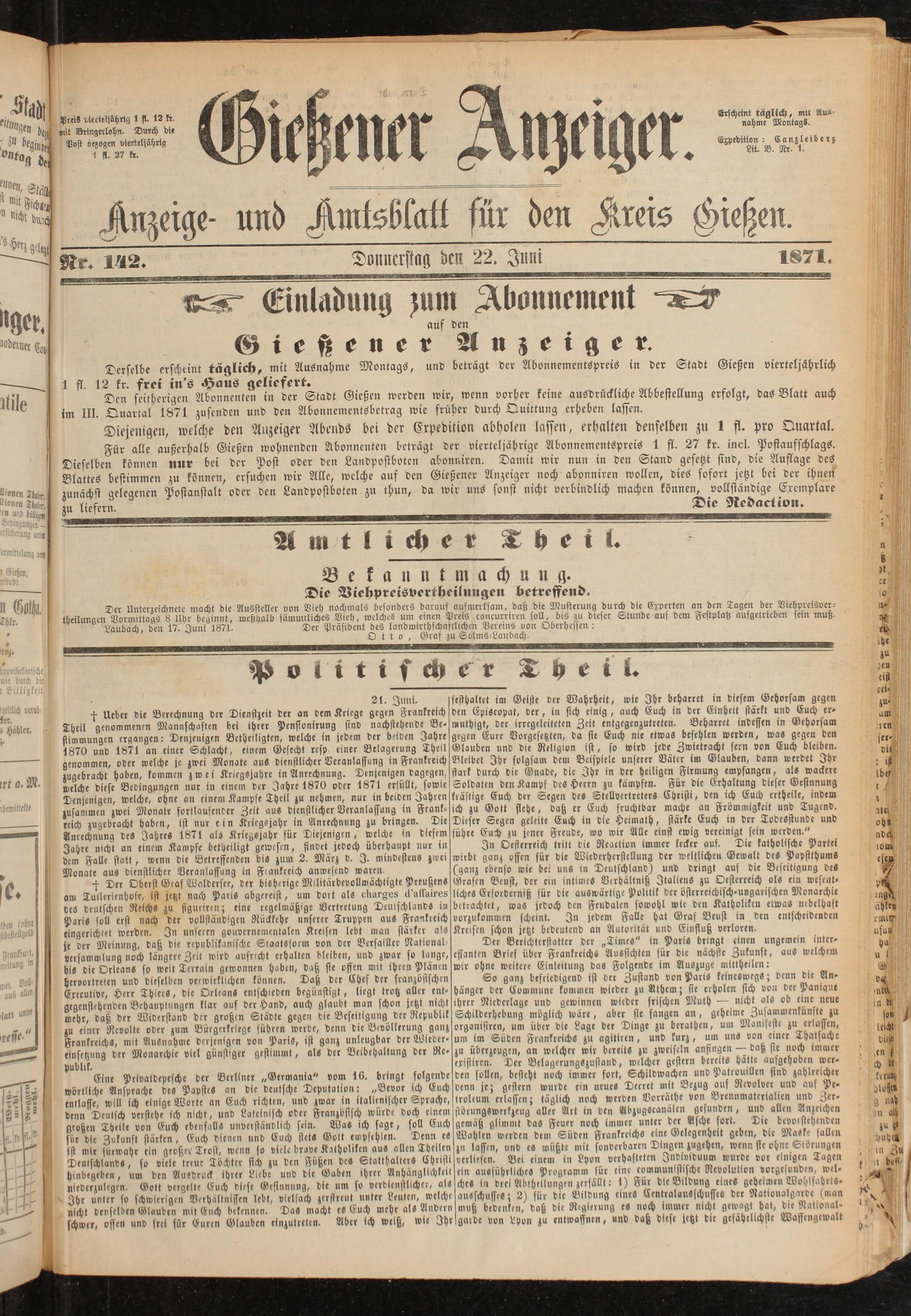 Den seitherigen Abonnenten in der Stadt Gießen werden wir, wenn vorher keine ausdrückliche Abbestellung erfolgt, das Blatt auch im III. Quartal 1871 zusenden und den Abonnementsbctrag wie früher durch Quittung erheben lassen.