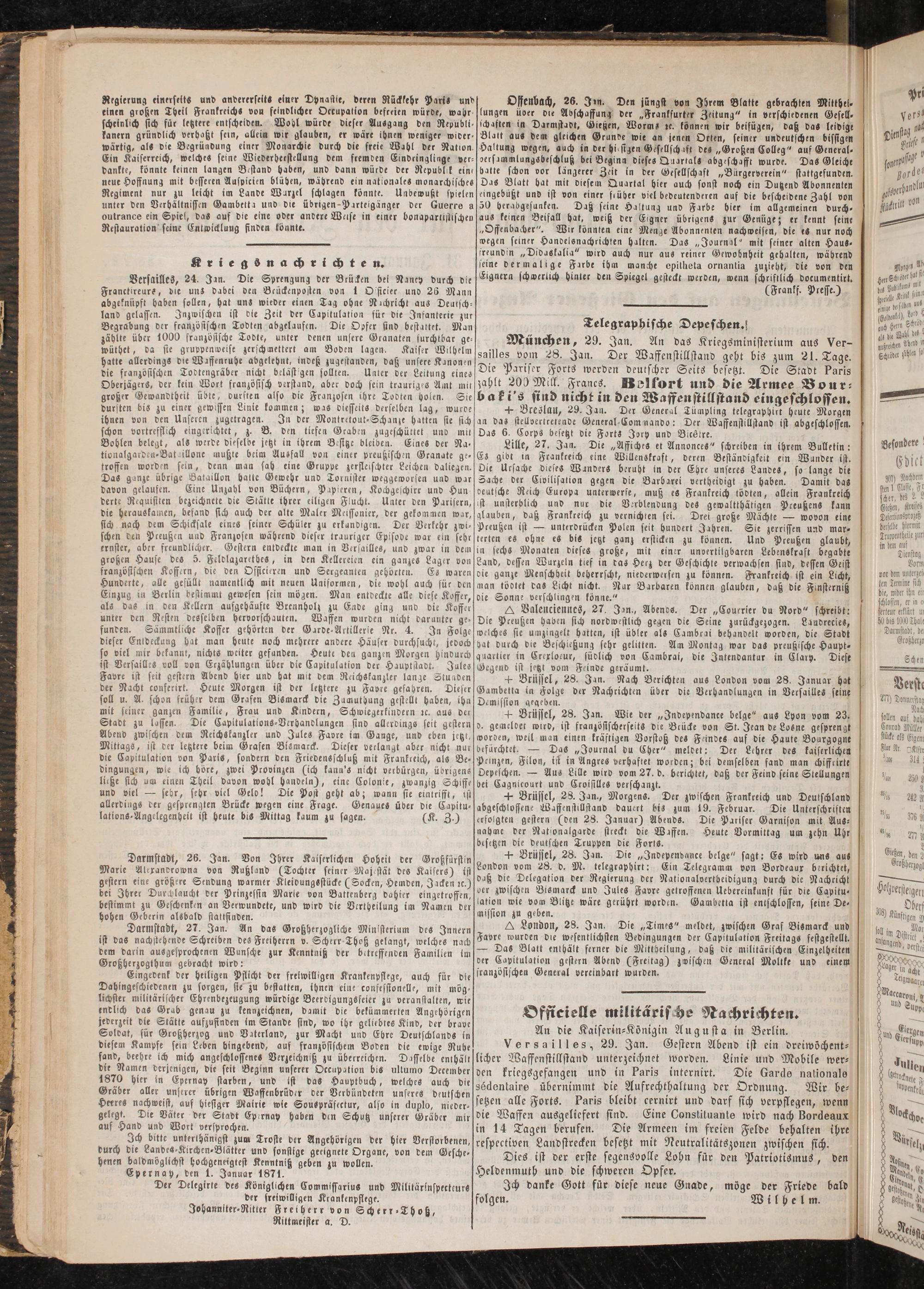 Versailles., 29. Jan. Gestern Abend ist ein dreiwöchentlicher Waffenstillstand unterzeichnet worden. Linie und Mobile werden kriegsgefangen und in Paris internirt. Die Garde nationale södentaire übernimmt die Aufrechthaltung der Ordnung. Wir besetzen alle Forts. Paris bleibt cernirt und darf sich verpflegen, wenn die Waffen ausgeliefert sind. Eine Constituante wird nach Bordeaux in 14 Tagen berufen. Die Armeen im freien Felde behalten ihre respectiven Landstrecken besetzt mit Neutralitätszonen zwischen sich.
