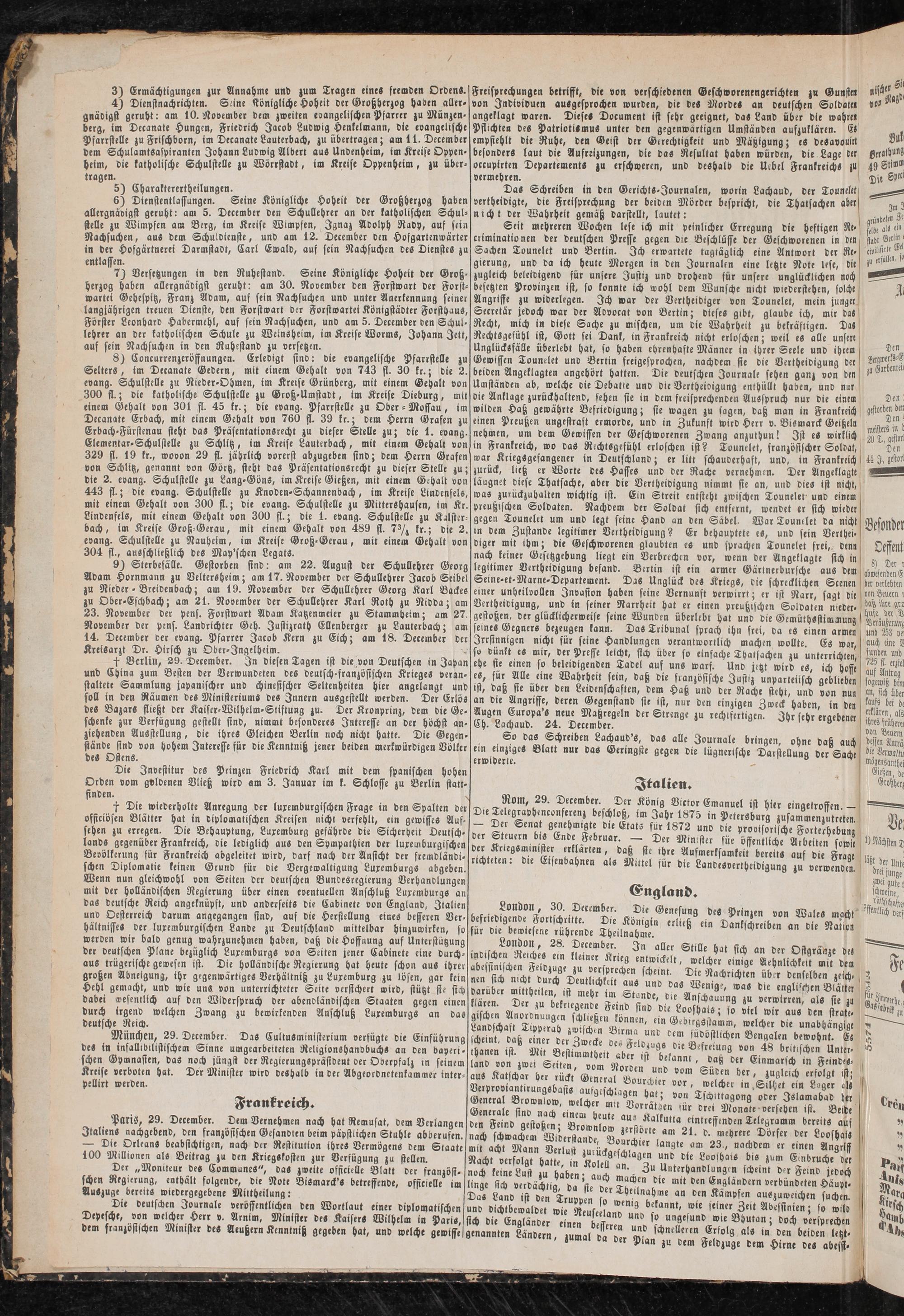 Paris, 29. December. Dem Vernehmen nach hat Remusat, dem Verlangen Italiens nachgebend, den französischen Gesandten beim päpstlichen Stuhle abberufen. — Die Orleans beabsichtigen, nach der Restitution ihres Vermögens dem Staate 100 Millionen als Beitrag zu den Kriegskosten zur Verfügung zu stellen.